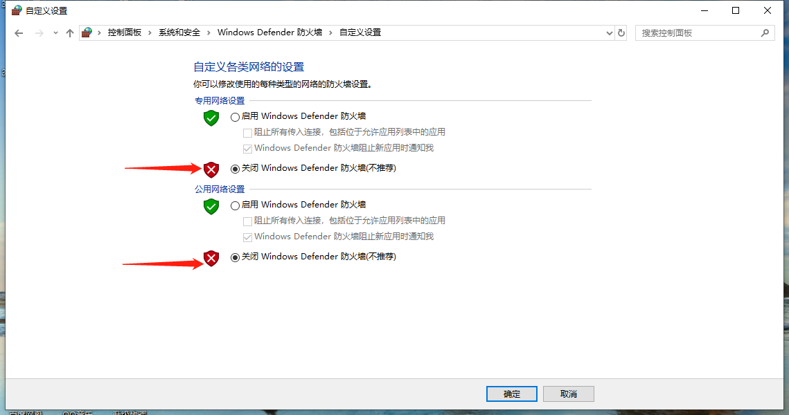 2、按路徑:控制面板找到“windows防火墻”和“更改適配器設(shè)置”選項,關(guān)閉防火墻并禁用與本次測試無關(guān)的網(wǎng)卡。并關(guān)閉電腦殺毒軟件。