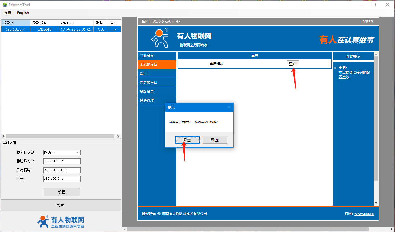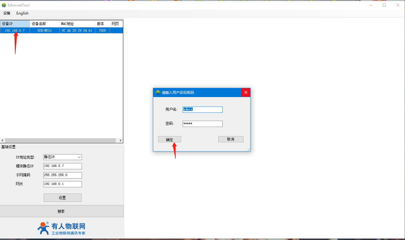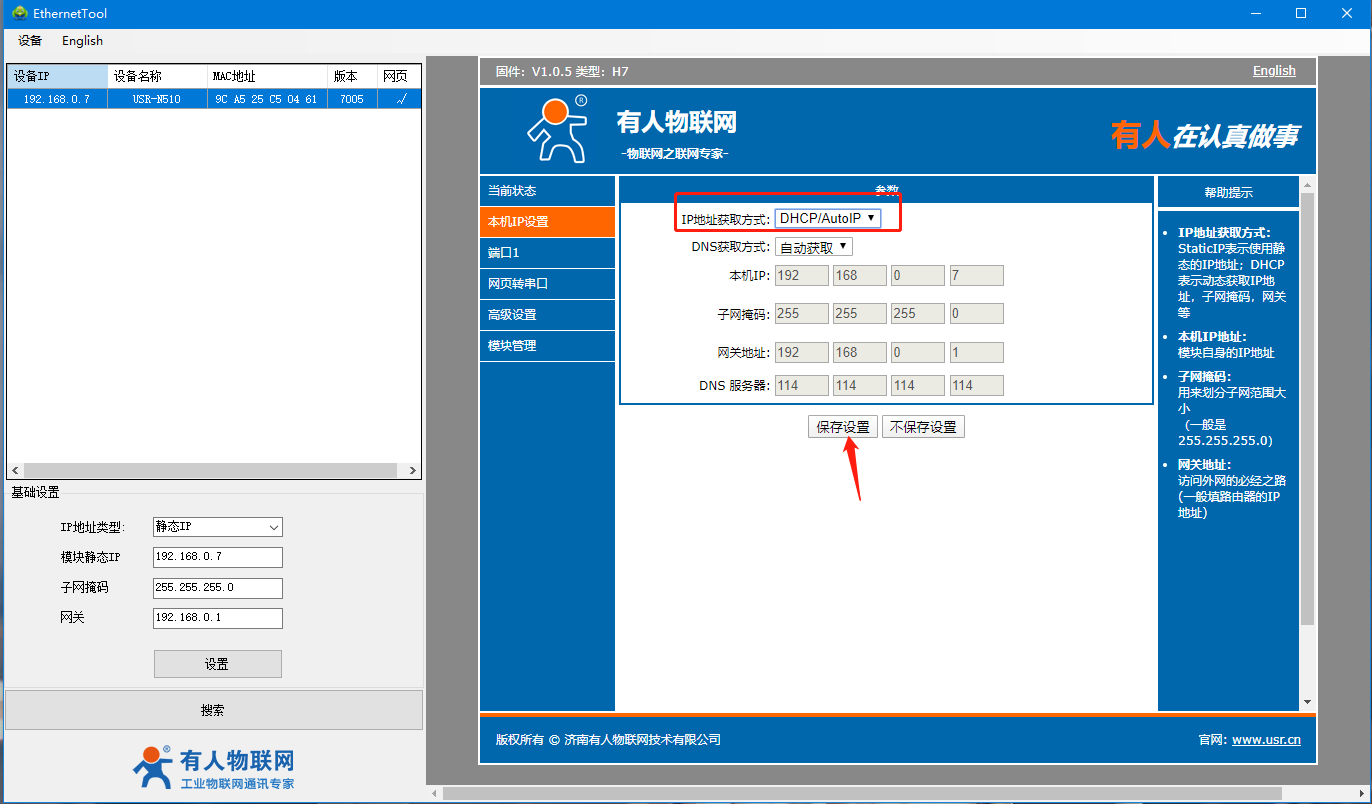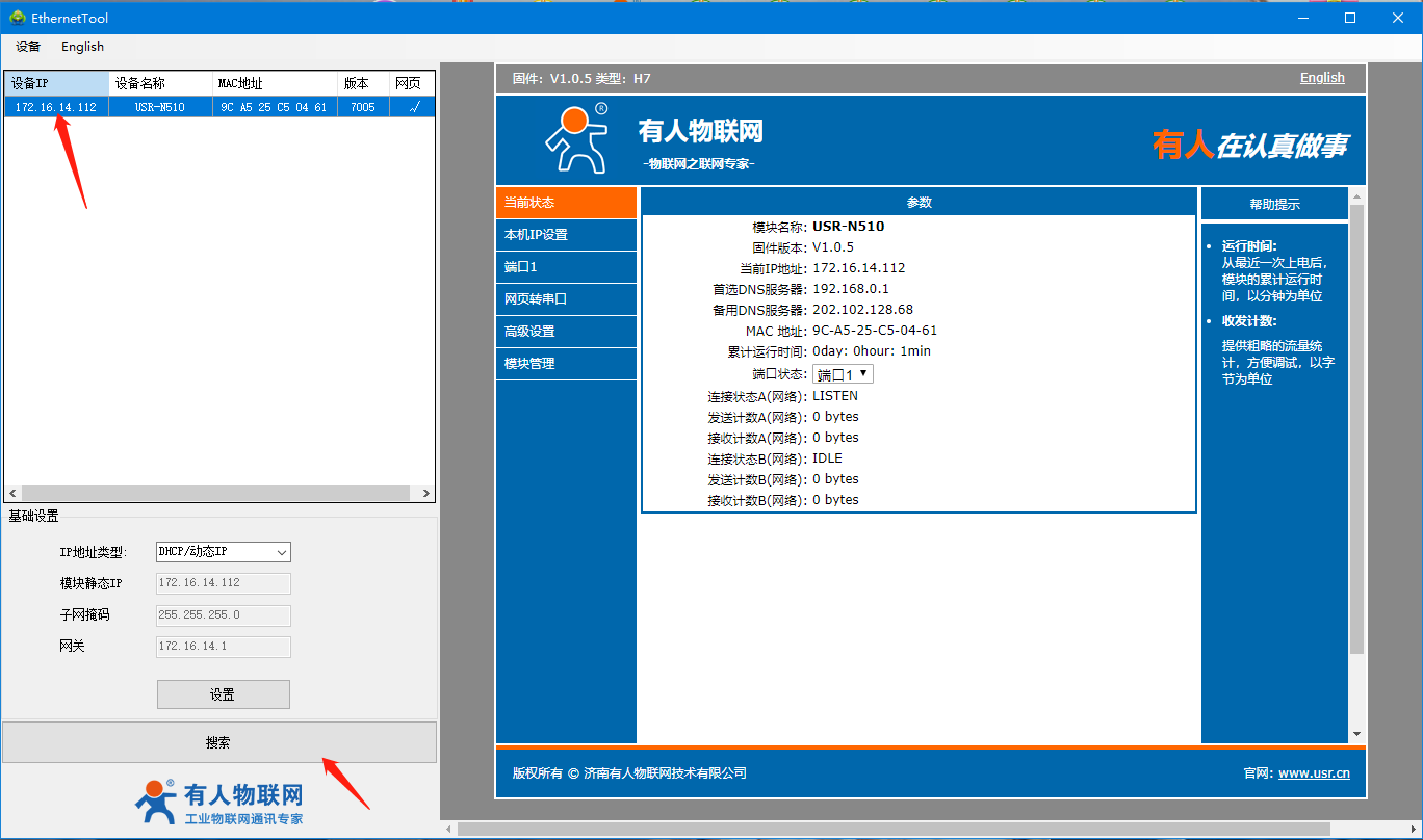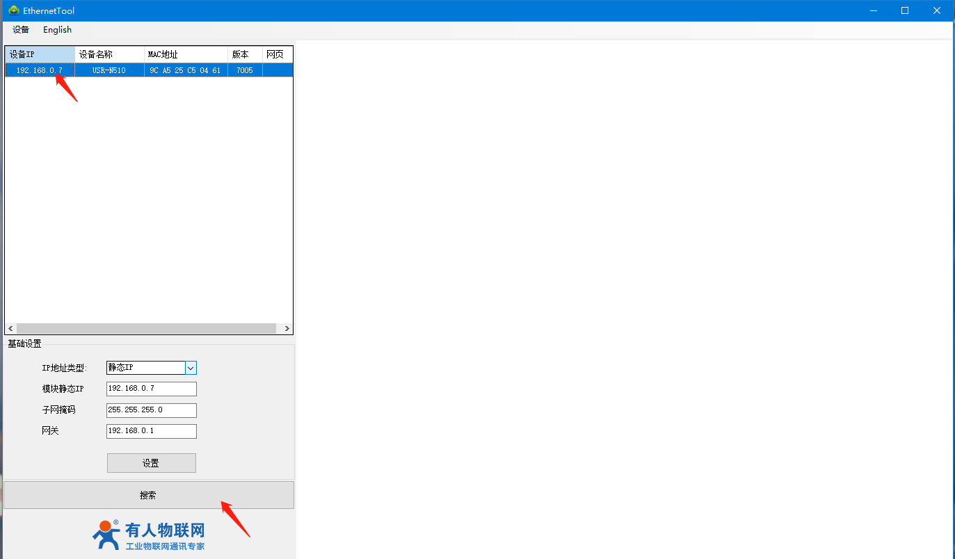 4、打開510(H7)系列設(shè)置軟件,點擊搜索設(shè)備,可以搜索到510,并且可以看到目前510的相關(guān)信息,IP為192.168.0.7(默認),設(shè)備名稱為:USR-N510,MAC地址為:9C A5 25 XX XX XX,版本為:7005。