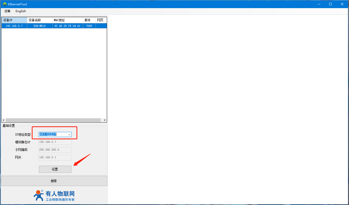 1)、設(shè)置軟件,點擊搜索設(shè)備點擊搜索到的設(shè)備,基礎(chǔ)設(shè)置部分,將510的IP地址類型修改為DHCP/動態(tài)獲取,然后點擊下方的設(shè)置