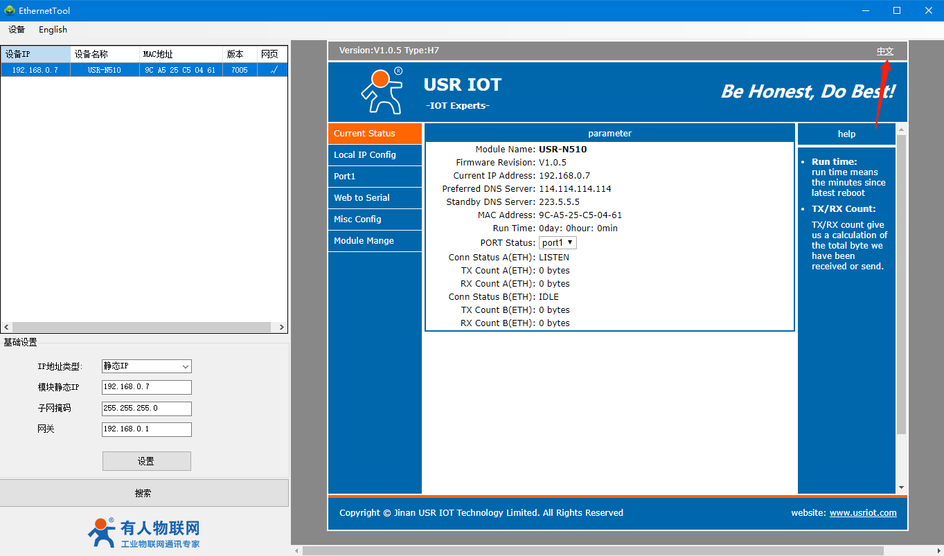 3)、進入510設(shè)置軟件內(nèi)部,可以看到設(shè)備目前相關(guān)信息,可在右上角切換成中文模式。