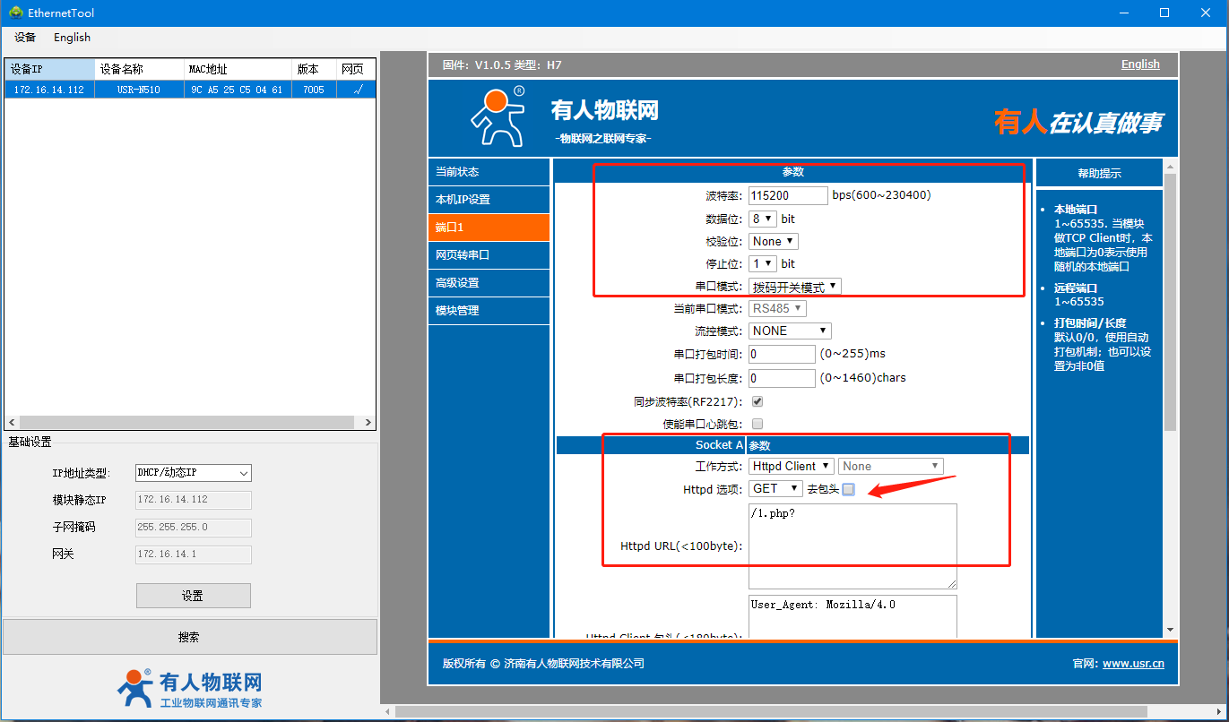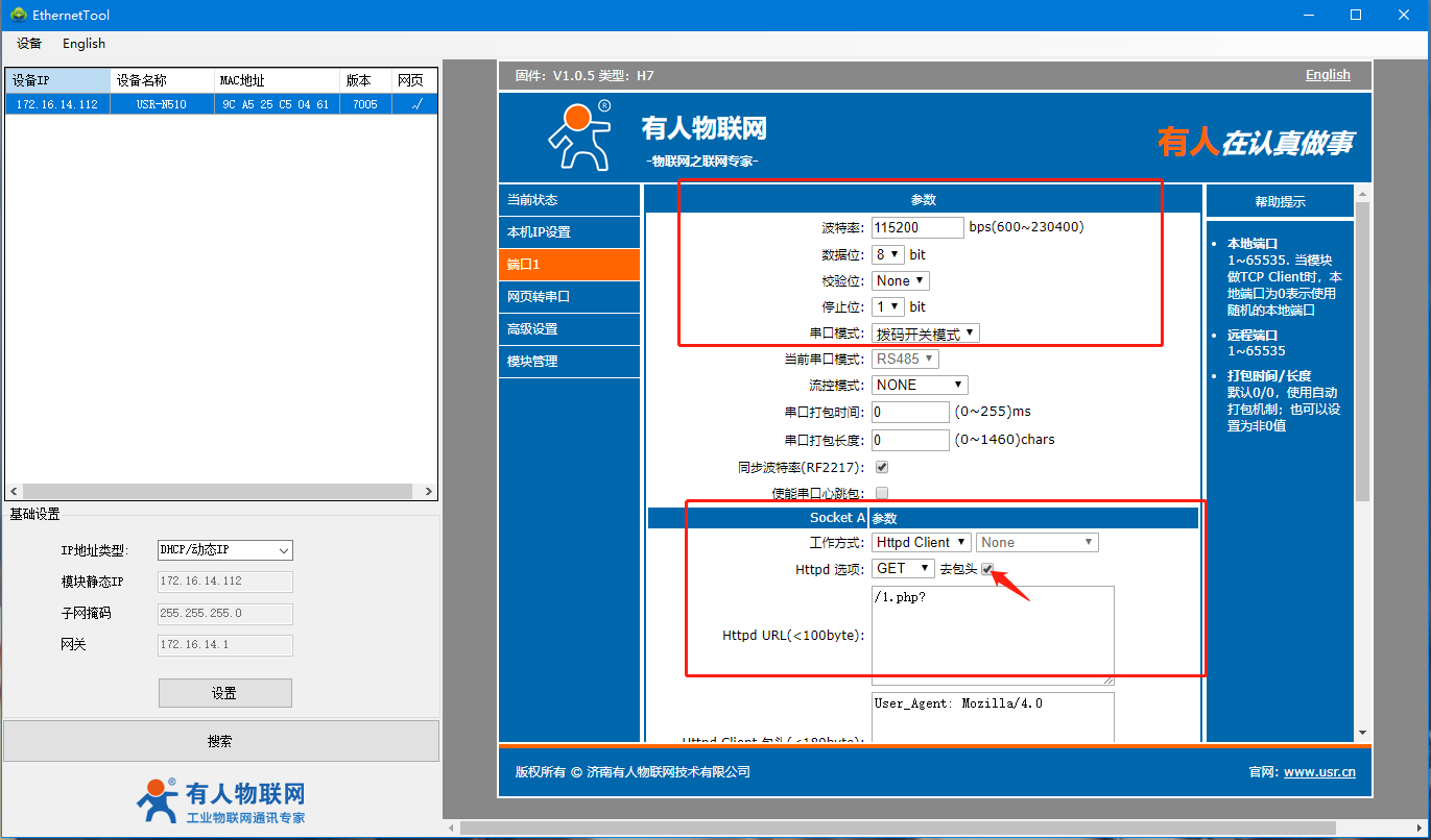 7、在端口1處,確認當(dāng)前串口參數(shù)(默認為115288,N,8,1)以及串口模式(網(wǎng)頁設(shè)置優(yōu)先級大于撥碼開關(guān)),默認為撥碼開關(guān)模式,所以我們需要將設(shè)備的撥碼撥到相應(yīng)位置,設(shè)置模塊工作方式:HTTP client,HTTPD選項設(shè)置為POST,點擊去包頭,最后我們獲取到的數(shù)據(jù)將不會存在包頭,URL為:/2.php? 。