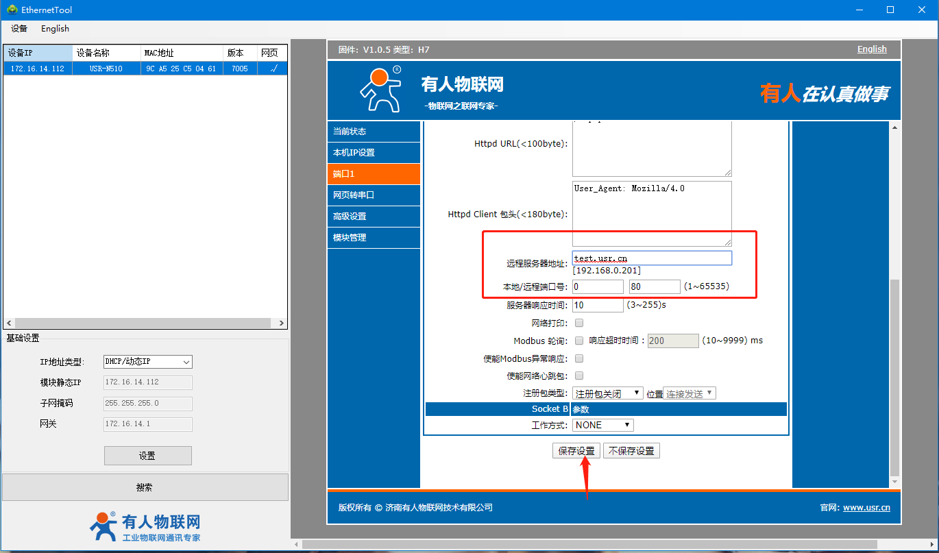 8、遠程服務(wù)器地址為:test.usr.cn,遠程端口為80。(這個是我司的測試服務(wù)器),參數(shù)設(shè)置無誤后點擊保存設(shè)置。
