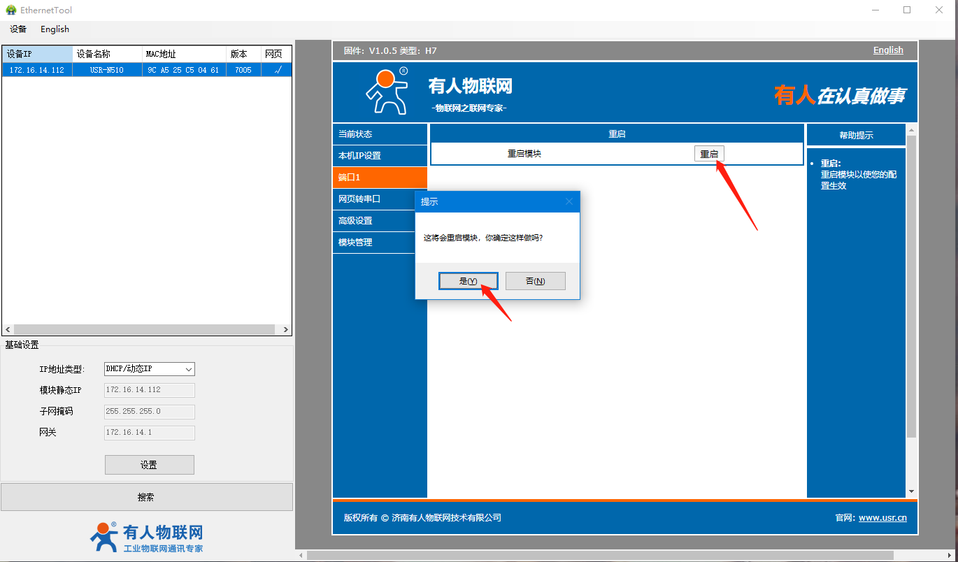 6、重啟成功之后,PC和510連接同一個路由器或者交換機,PC將設(shè)置的靜態(tài)IP改為動態(tài)獲取,使其在同一個局域網(wǎng)下,打開510的設(shè)置軟件,點擊搜索設(shè)備,可以看到路由器分配給510的IP為172.16.14.112,進入510設(shè)置軟件內(nèi)部。