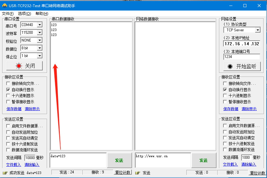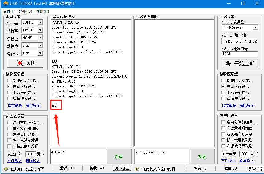 發(fā)送123,收到返回數(shù)據(jù)123
