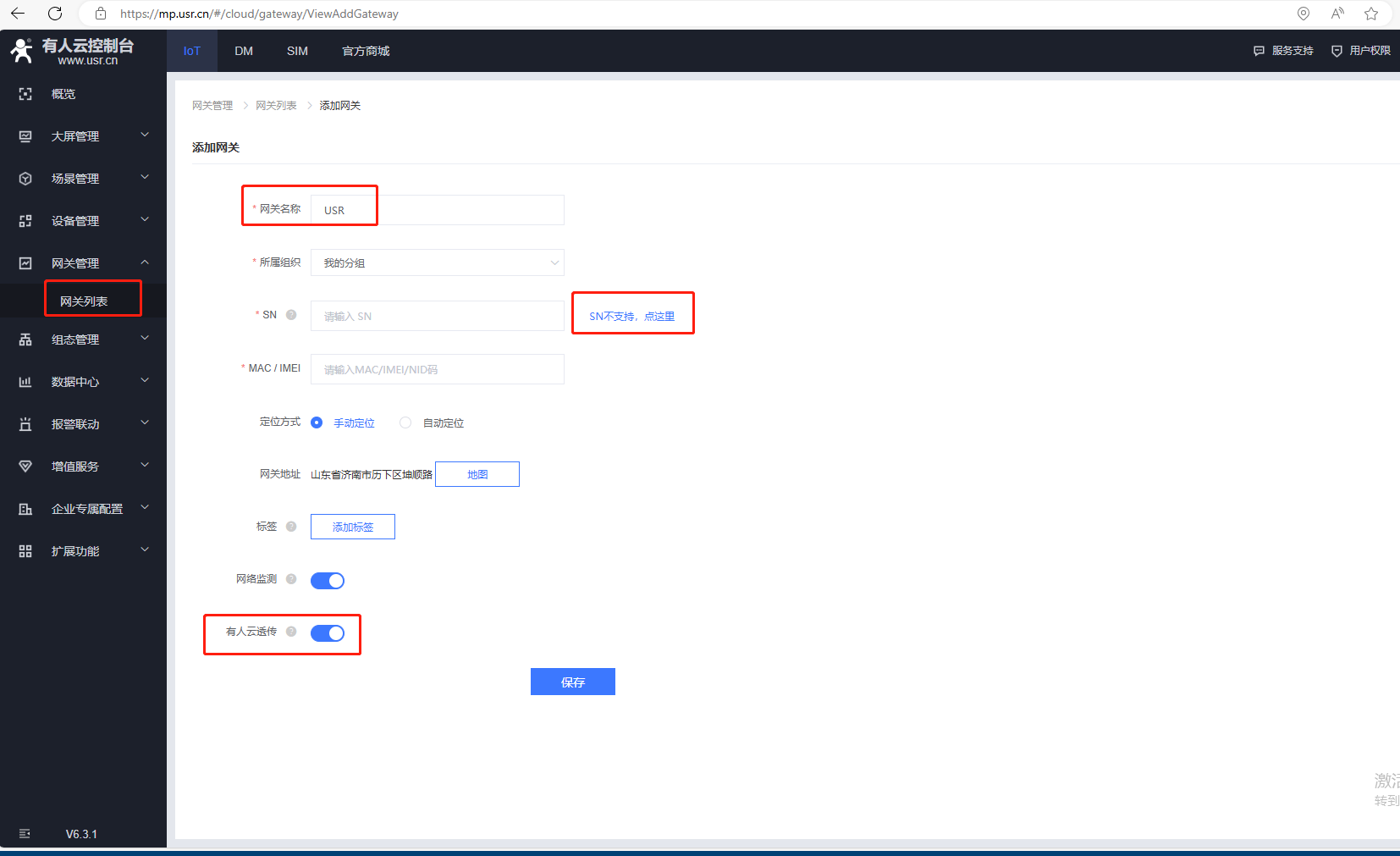 2、USR-VCOM虛擬串口添加,點(diǎn)擊SN不支持,點(diǎn)這里,用自動(dòng)生成的ID方式上云,在有人云上添加設(shè)備,勾選有人云透?jìng)鳌?/p>