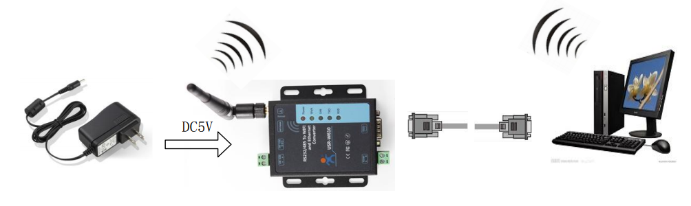 我們將 USR-W610 串口服務(wù)器的串口與計(jì)算機(jī)的串口連接,串口服務(wù)器的 WIFI 和計(jì)算機(jī)的 WIFI 連接。臺(tái)式機(jī)如無(wú)自帶串口和 WIFI,可以用 USB 轉(zhuǎn) 232 線和無(wú)線網(wǎng)卡 來(lái)替代。硬件連接如下圖: