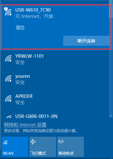 1、電腦打開(kāi)無(wú)線網(wǎng)絡(luò)連接,搜索網(wǎng)絡(luò),如下圖的“USR-W610_xxxx”(xxxx 是 MAC 地址后四位)即是模塊的默認(rèn)網(wǎng)絡(luò)名稱(SSID)。電腦關(guān)閉防火墻與殺毒軟件并禁用除了wifi之外其他的網(wǎng)卡。