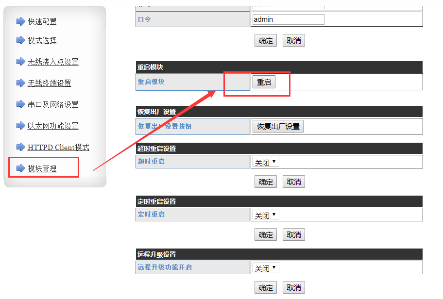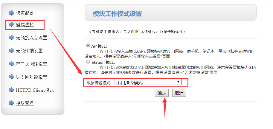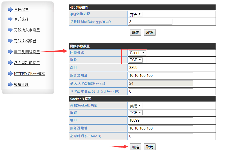 2、電腦瀏覽器地址欄輸入模塊默認(rèn)IP:10.10.100.254,賬號(hào)和密碼都是admin,進(jìn)入內(nèi)置網(wǎng)頁(yè),模式選擇 -> 數(shù)據(jù)傳輸模式 -> 串口指令模式,點(diǎn)擊確定,串口及網(wǎng)絡(luò)設(shè)置 -> 網(wǎng)絡(luò)參數(shù)設(shè)置 -> 網(wǎng)絡(luò)模式配置為client,點(diǎn)擊確定,重啟模塊。