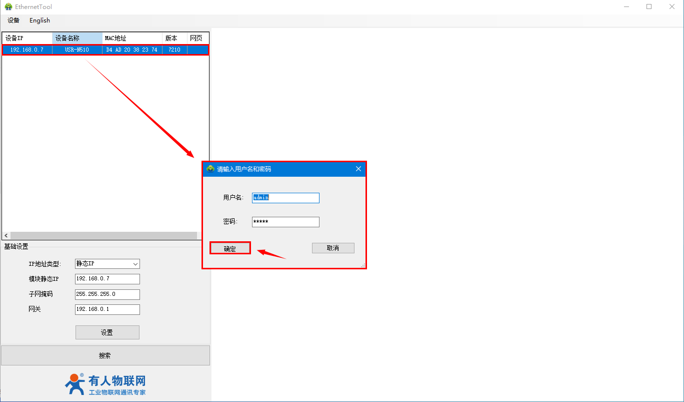 用H7系列配置軟件搜索N510設(shè)備,單擊搜索,搜搜到設(shè)備后雙擊設(shè)備。