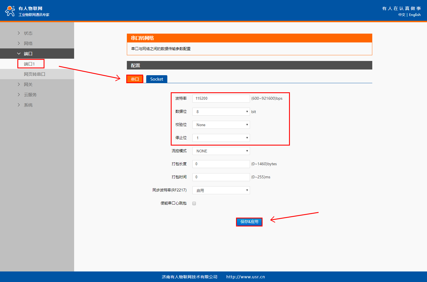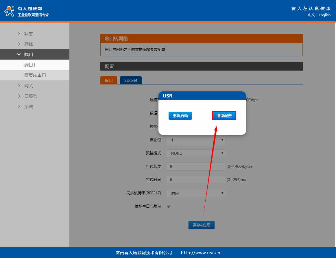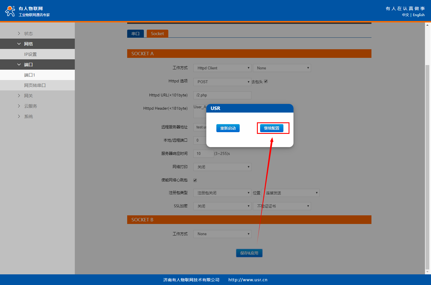 在“端口”>“端口1”界面中的“Socet”配置Socket A的工作模式為“Httpd Clinet”
