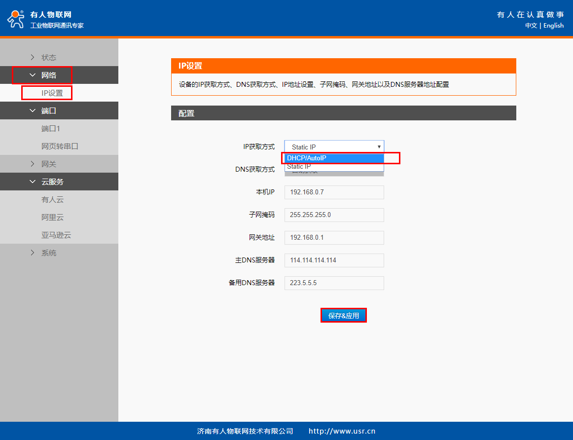 9、N510在“網(wǎng)絡(luò)”>“IP設(shè)置”界面中配置本機(jī)ip設(shè)置中,可以配置DHCP自動(dòng)獲取或者設(shè)置靜態(tài)ip, 本案例配置為DHCP自動(dòng)獲取IP,若需要配置510靜態(tài)IP上網(wǎng)的話可以自行設(shè)置靜態(tài)ip(Static IP)。