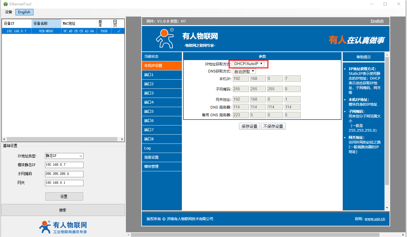 將IP地址獲取方式從Static IP改為DHCP,保存設(shè)置,重啟模塊。