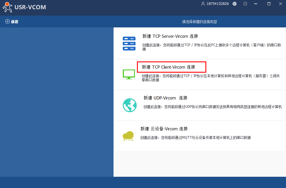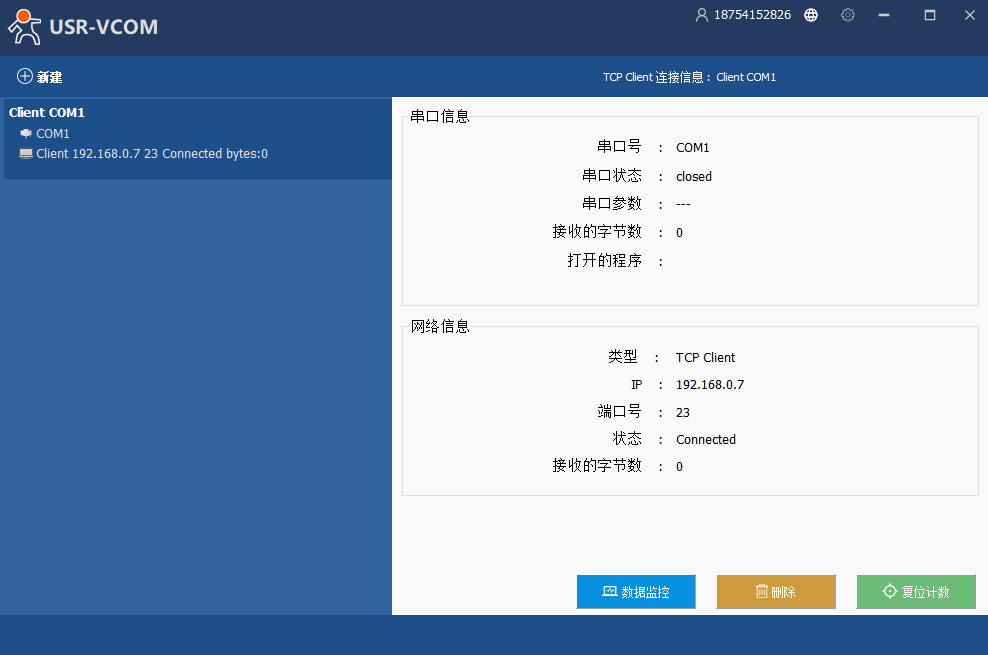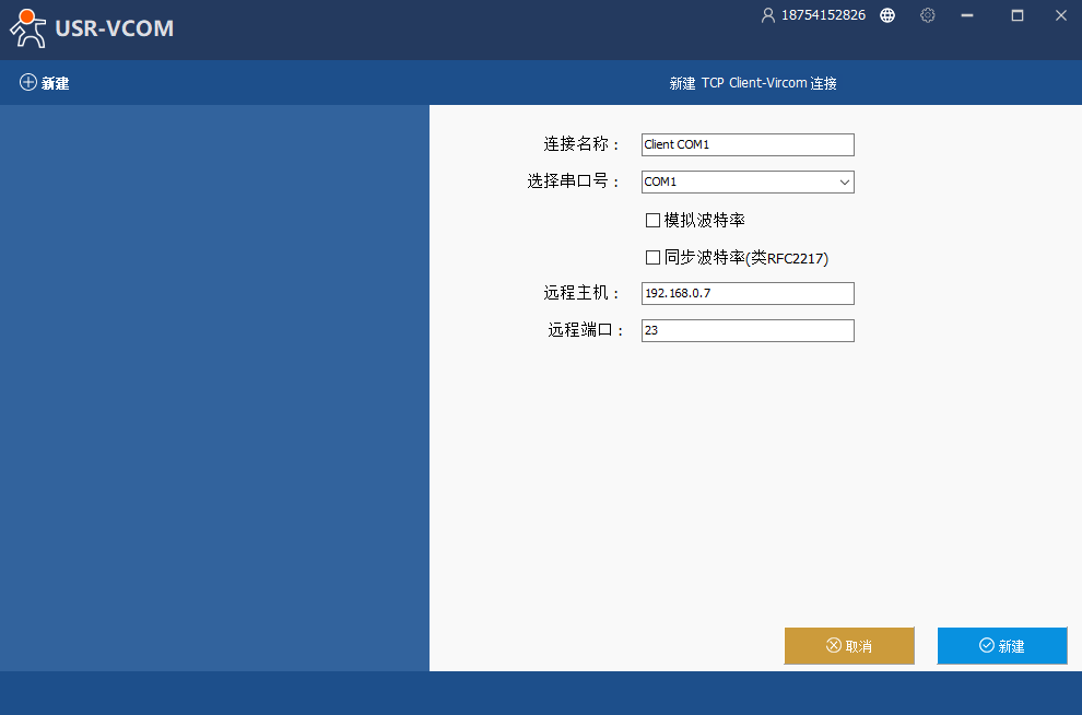 電腦下載的虛擬串口軟件,新建TCP-Client-Vircom連接,添加一個虛擬串口COM1。遠程IP填N580的IP,遠程端口填N580的端口23。