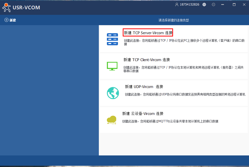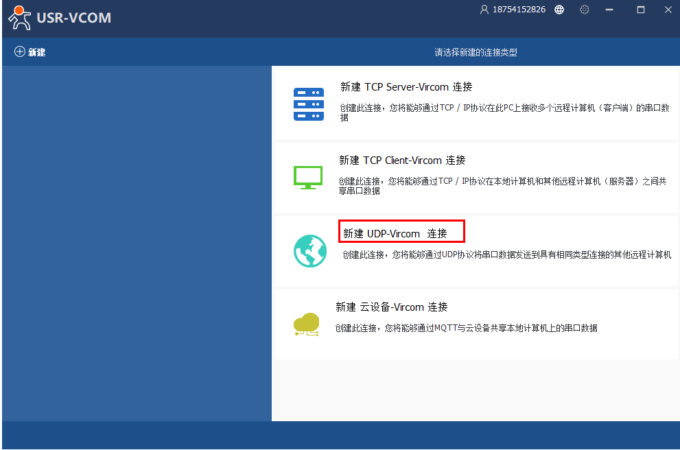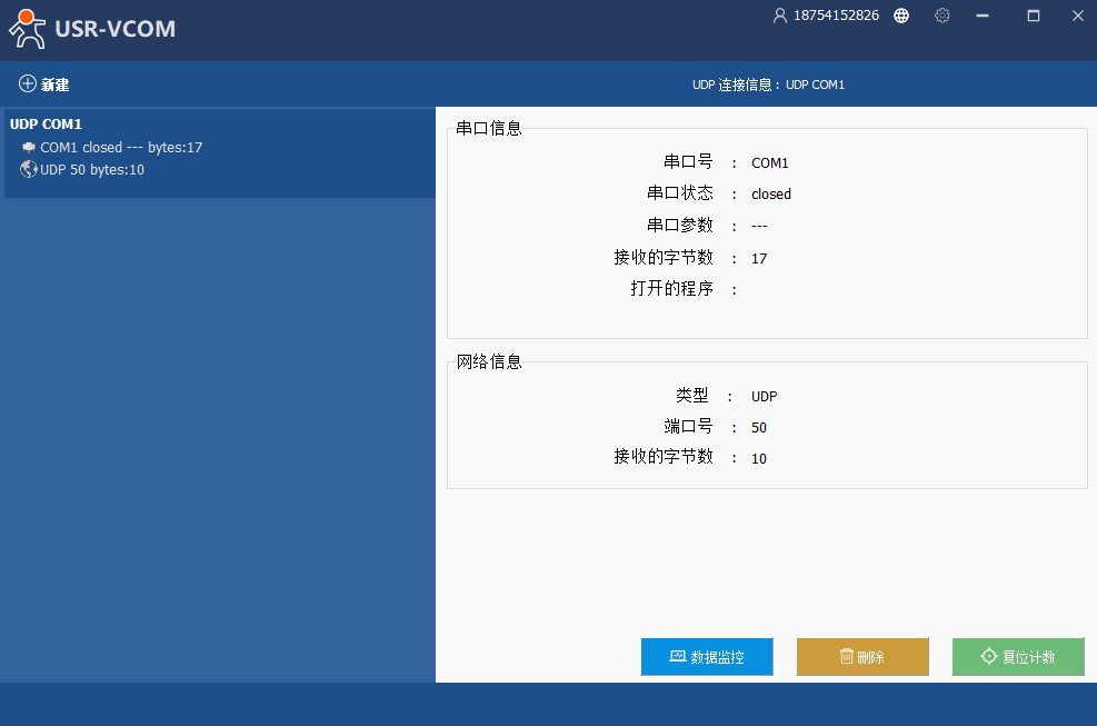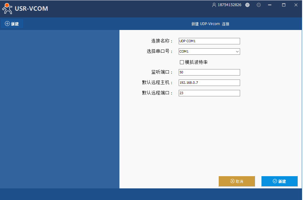 電腦下載的虛擬串口軟件,新建UDP-Vircom連接,添加一個虛擬串口COM1。遠程IP填N580的IP,遠程端口填N580的端口23。監(jiān)聽端口號填50。