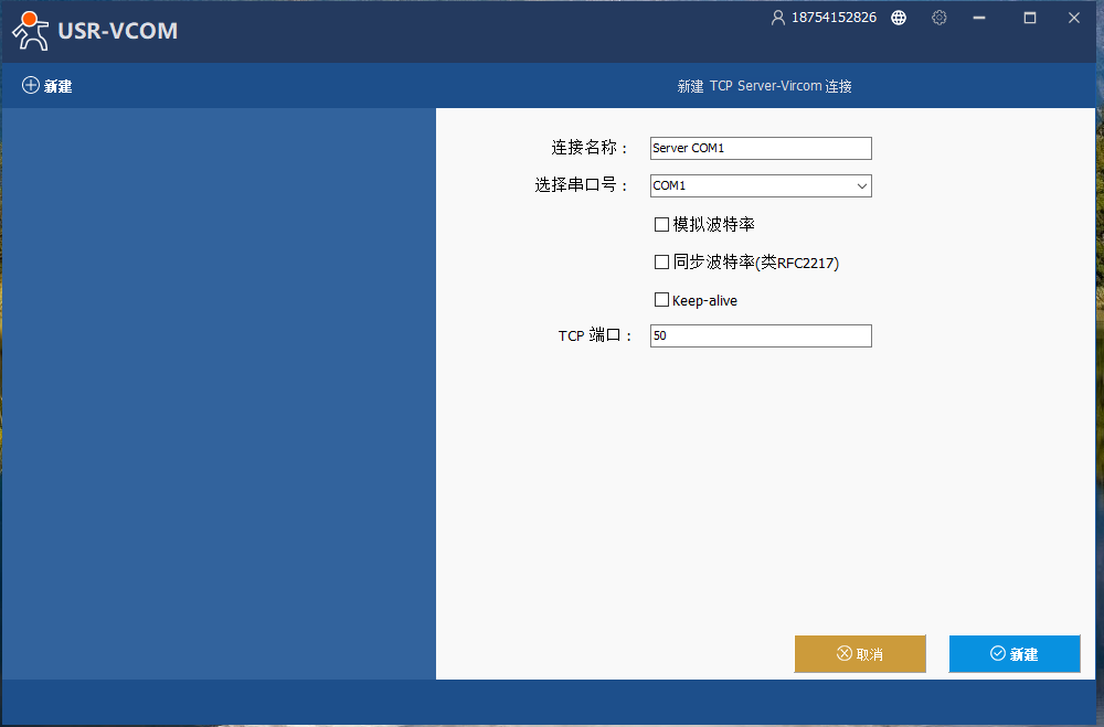 電腦下載的虛擬串口軟件,新建TCP-Server-Vircom連接,添加一個虛擬串口COM1。本地端口填50。