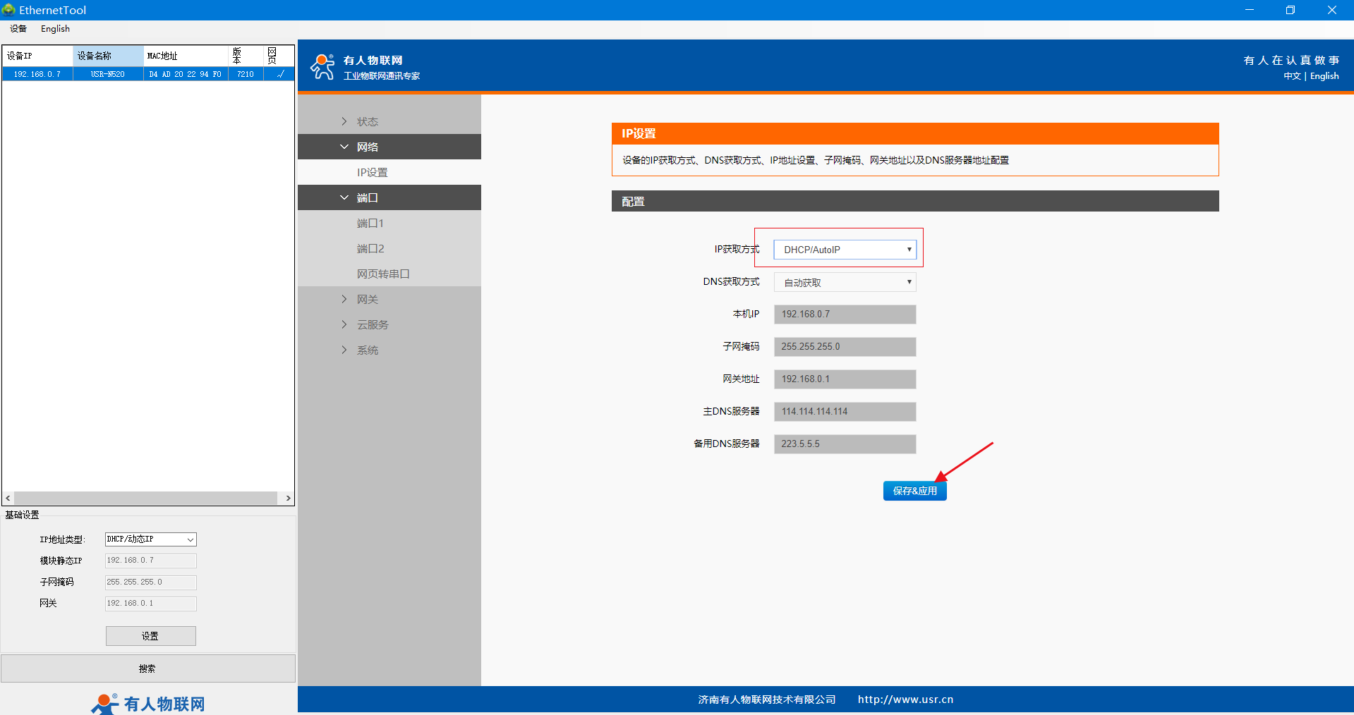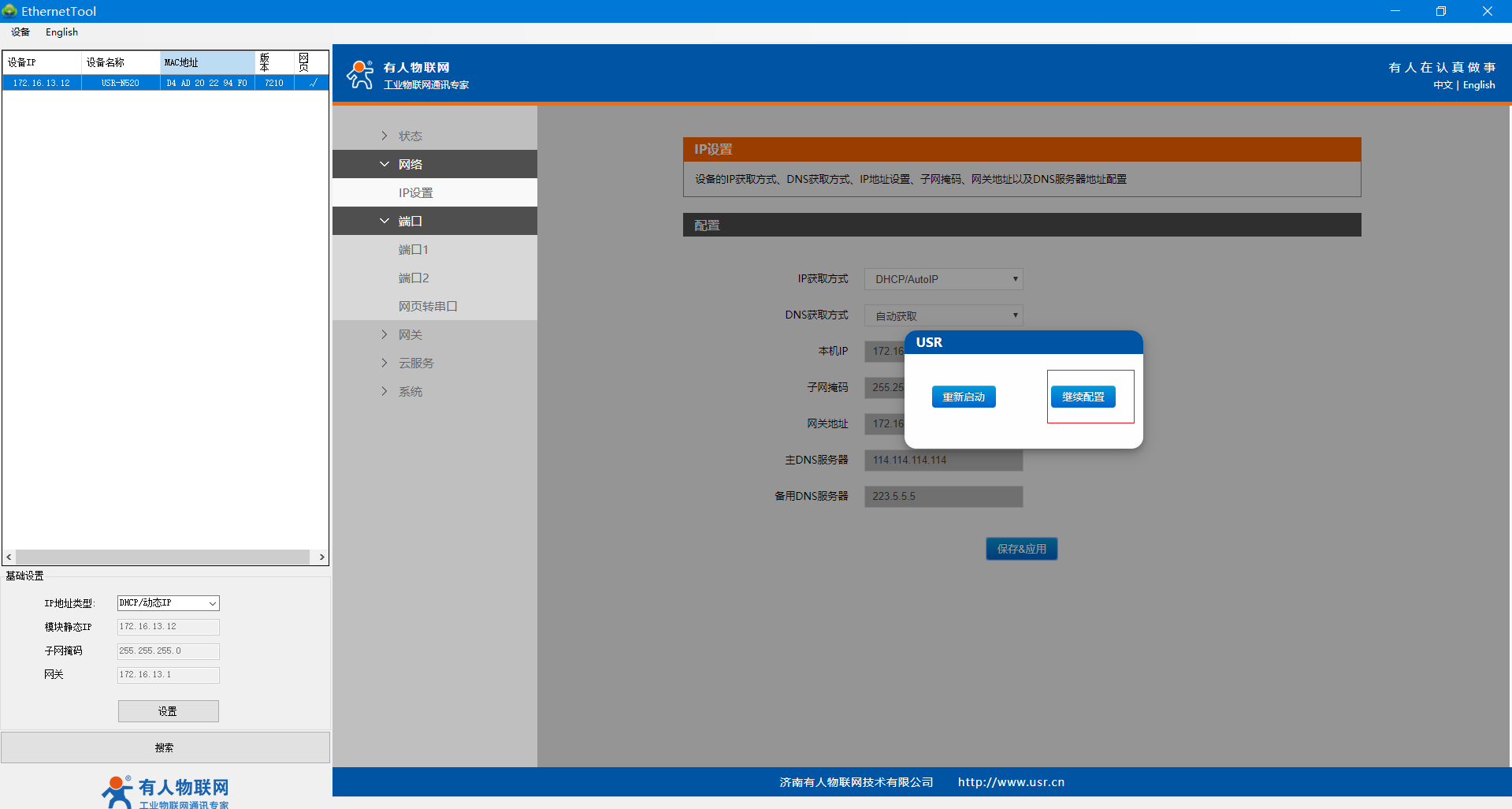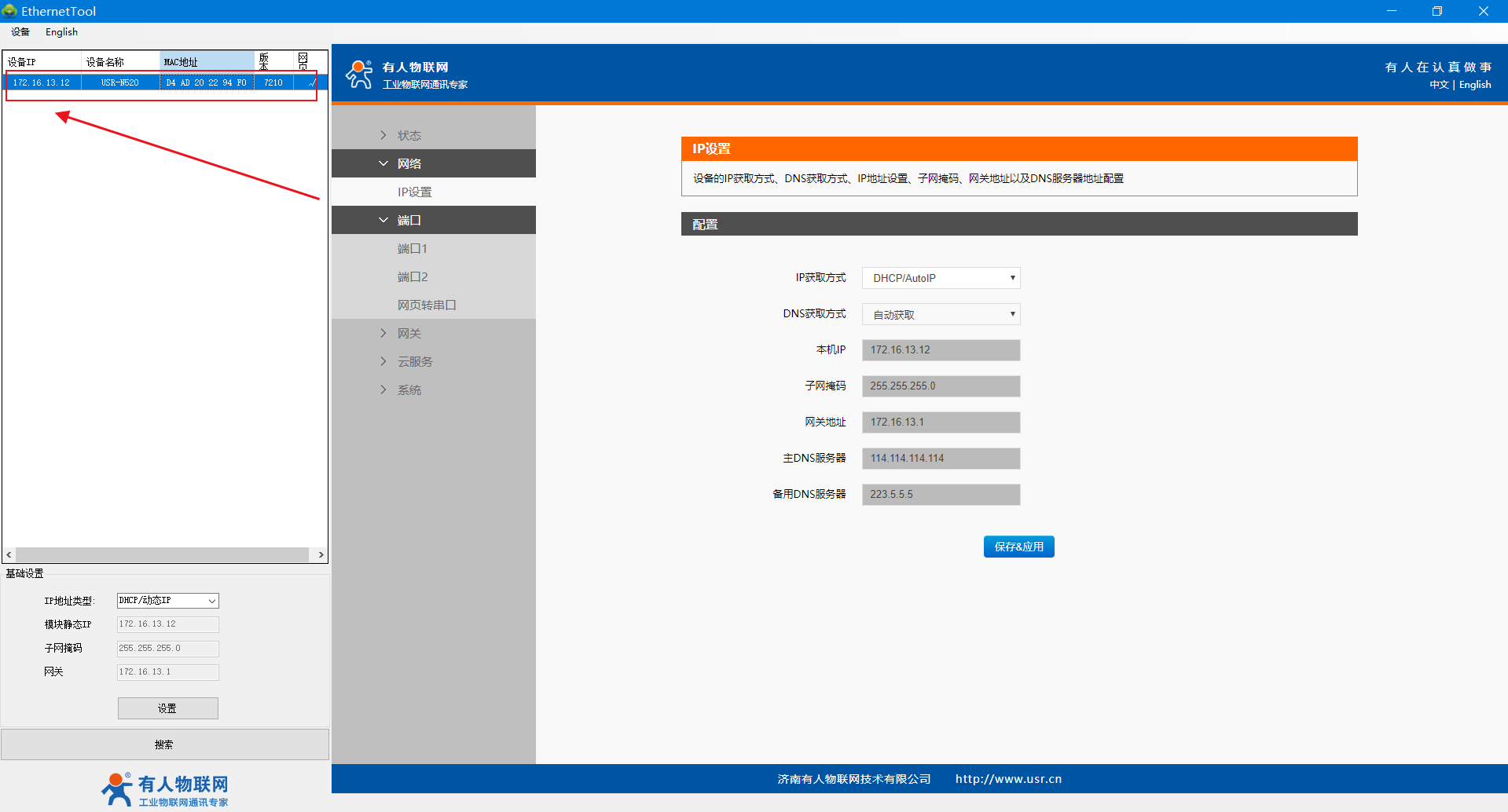 5、網(wǎng)線直連N520的網(wǎng)口和路由器的LAN口,保證N510正常上網(wǎng),電腦連接路由器的WiFi,電腦和路由器同一網(wǎng)段,設(shè)置軟件重新搜索設(shè)備,可看到路由器分配給N510的IP。