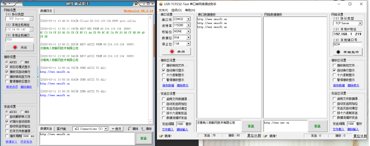 7、打開串口,串口參數(shù)和N520的串口參數(shù)保持一致,網(wǎng)絡(luò)端點(diǎn)擊鏈接,如下圖有連接對象顯示,網(wǎng)絡(luò)端和串口端互發(fā)數(shù)據(jù)測試。