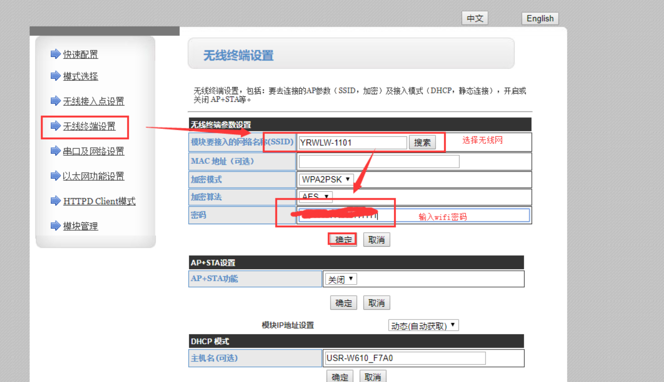 4.配置WiFi:無線終端設(shè)置,搜索選擇WiFi,并填入WiFi密碼。