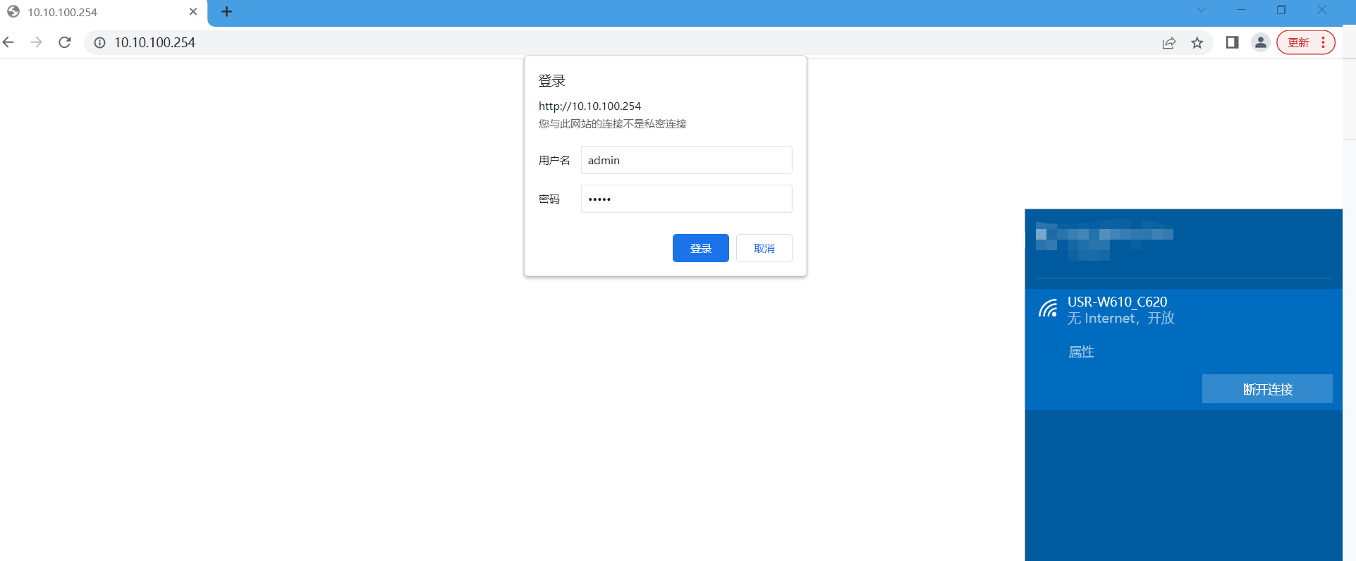 2. 電腦連接w610的WiFi,并在瀏覽器中輸入610的IP10.10.100.254,輸入用戶名密碼admin,進(jìn)入610的內(nèi)置網(wǎng)頁。