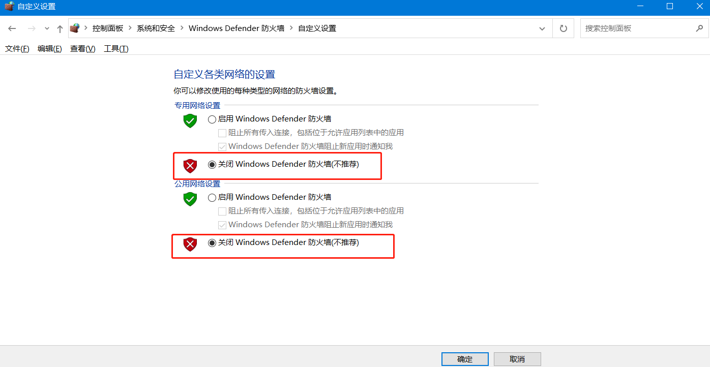 1.按路徑:控制面板——網(wǎng)絡(luò)和Internet——網(wǎng)絡(luò)和共享中心找到“windows防火墻”和“更改適配器設(shè)置”選項,關(guān)閉防火墻并禁用與本次測試無關(guān)的網(wǎng)卡。并關(guān)閉電腦殺毒軟件。