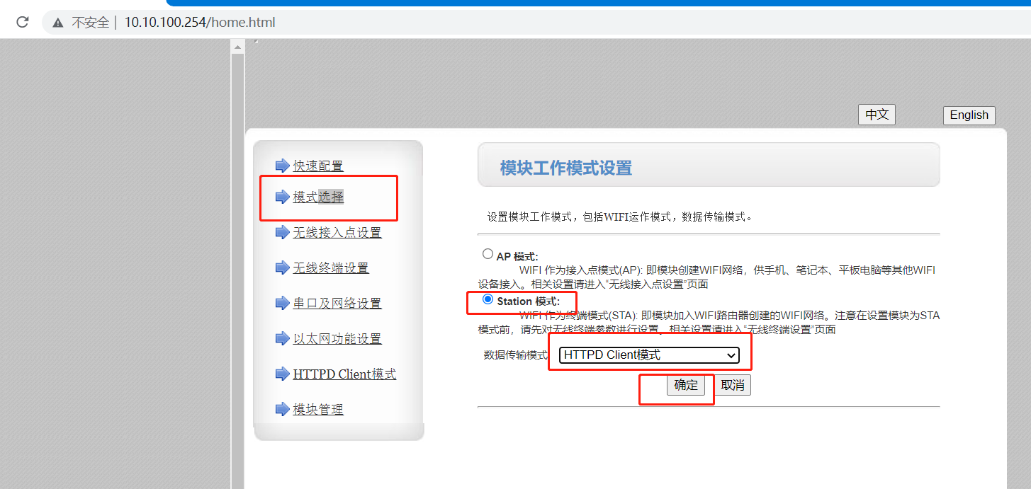 3. 模式選擇:station模式,數(shù)據(jù)傳輸模式選擇HTTPD Client模式,單擊確定。【配置完所有的參數(shù)再重啟模塊】