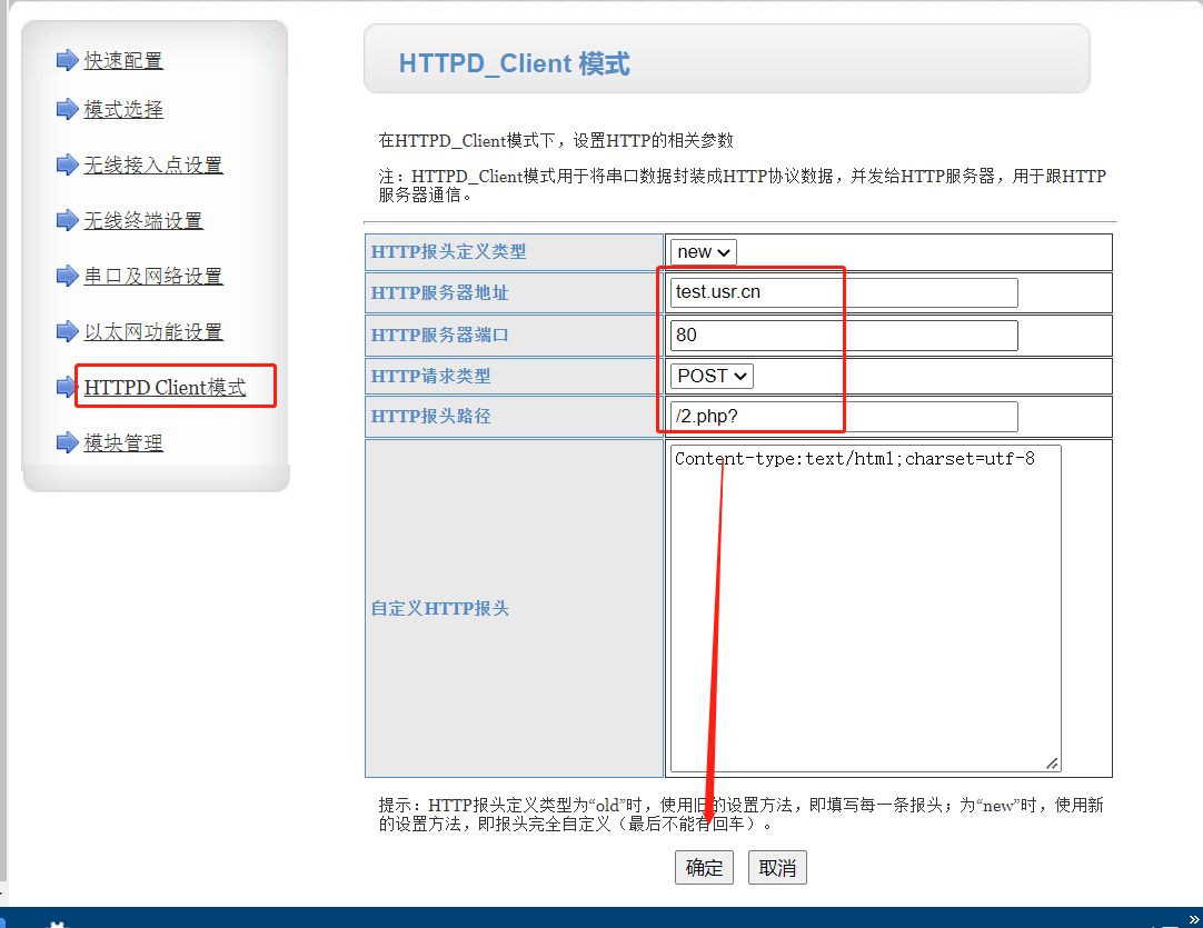 4. 點(diǎn)擊httpd client 模式HTTP報頭定義類型為new,HTTP服務(wù)器地址:test.usr.cn(我司測試服務(wù)器), HTTP服務(wù)器端口號為80,HTTP報頭路徑為/2.php?data=,設(shè)置完成點(diǎn)擊確定,在模塊管理點(diǎn)擊重啟。