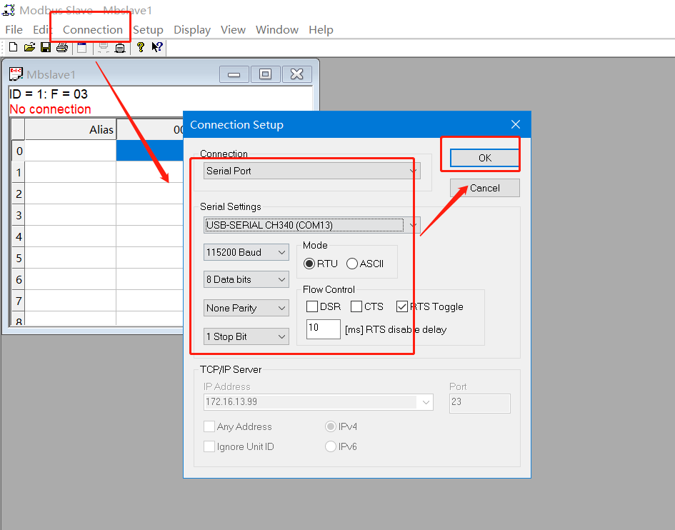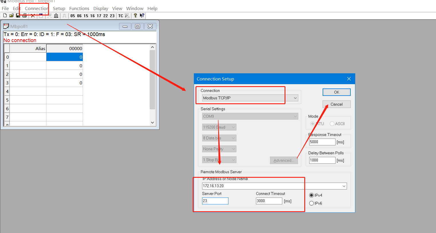 使用 modbus Poll 模擬云端進(jìn)行查詢,“Connection”--“connect”界面配置連接參數(shù):