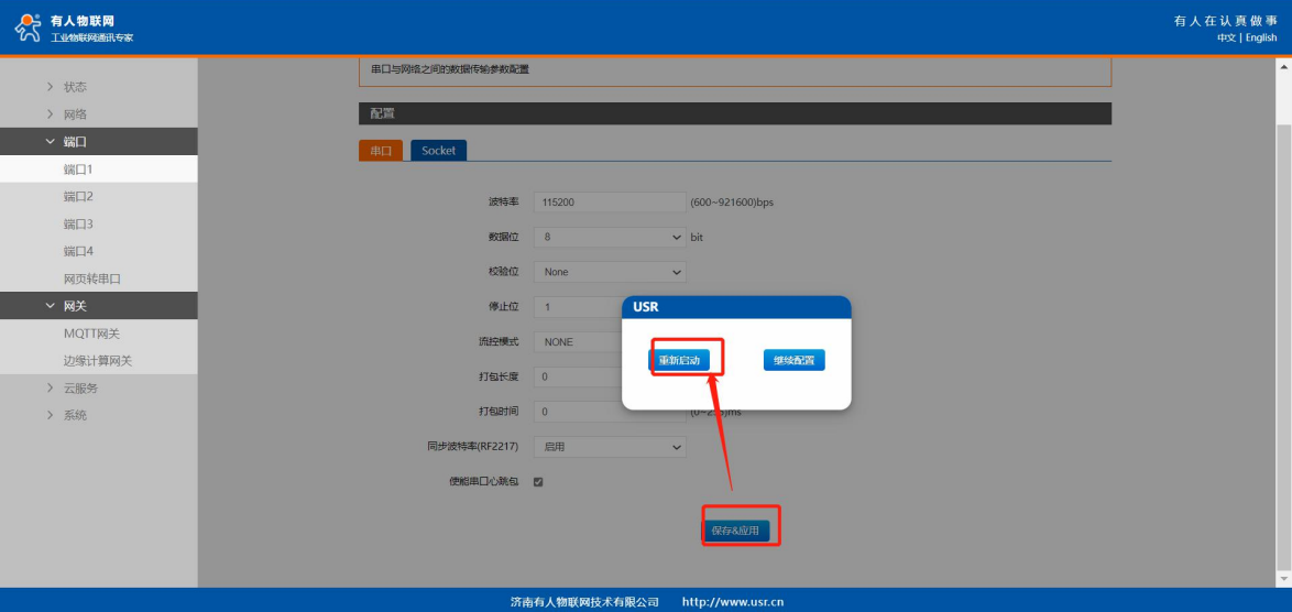 (3) 點(diǎn)擊“保存&應(yīng)用”,會(huì)彈出提示框,因此例中所有的配置項(xiàng)均已配置完成,所以點(diǎn)擊“重新啟動(dòng)”,令配置生效。 設(shè)備中的所有功能,配置完成都需要點(diǎn)擊下方保存按鍵,最終需要重啟后生效。以下不再提示。