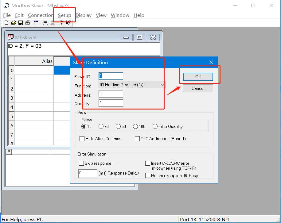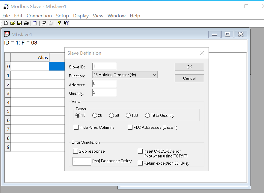 配置從機(jī)模擬軟件 “Setup”--“Slave Definition”界面,配置從機(jī)信息如下: