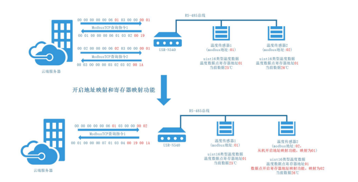 (3)示例:設(shè)備串口 1 下有從機(jī)地址為 01、02 兩個(gè)從機(jī),01 從機(jī)下有一個(gè)數(shù)據(jù)點(diǎn),寄存器地址 01,02 從機(jī)下也有一個(gè)數(shù)據(jù)點(diǎn),寄存 器地址 01。若未開(kāi)啟映射功能,使用 modbus 查詢,需要 01 03 0000 00001、02 03 0000 0001 兩條指令分別查詢。開(kāi)啟映射功能后, 將 02 從機(jī)的從機(jī)地址映射為 01、數(shù)據(jù)點(diǎn)寄存器地址映射為 02,即可使用 01 03 0000 0002 一條指令查詢不同從機(jī)下的兩個(gè)數(shù)據(jù)點(diǎn)。