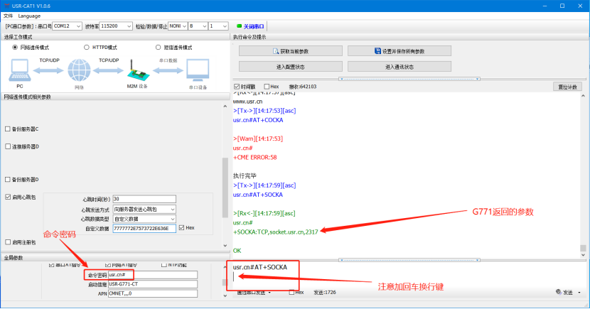 2>發(fā)送usr.cn#AT+SOCKA,AT指令最后一定要加回車換行