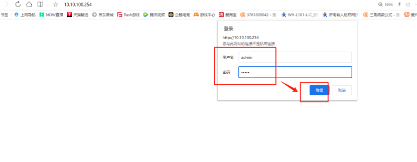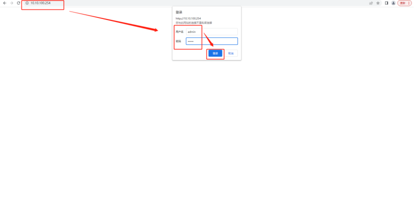 1)電腦連接1號w610的WiFi,瀏覽器打開輸出出廠默認(rèn)IP:10.10.100.254,用戶名和密碼都是:admin,進入內(nèi)置網(wǎng)頁
