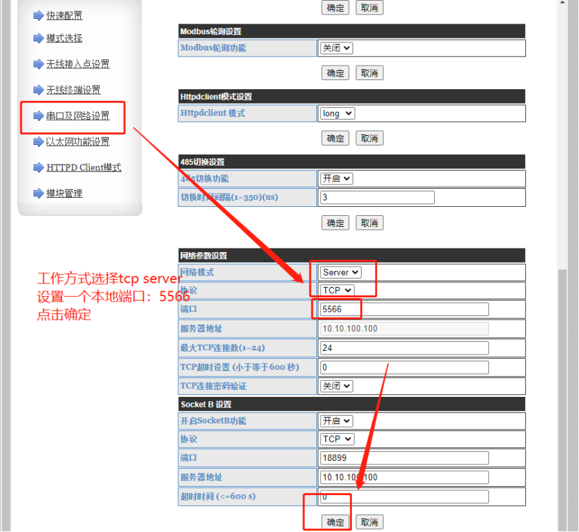 3)在串口及網(wǎng)絡(luò)設(shè)置,波特率等參數(shù)修改成和要接的串口設(shè)備一致。(這里測試修改成9600),點擊確定。工作模式設(shè)置TCP server,設(shè)置本地端口:5566,點擊確定。