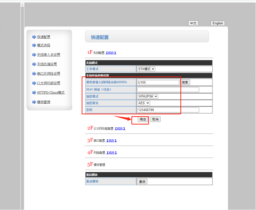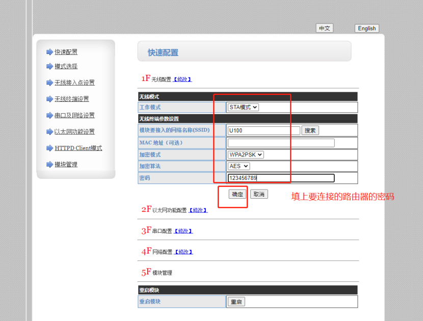 2)1號USR-W610設(shè)置STA模式,連接路由器的WiFi,填上密碼,點擊確定