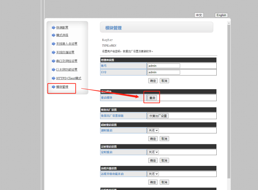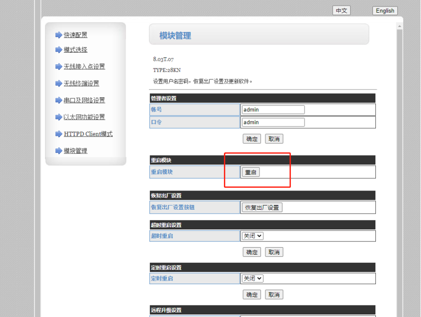 4)在模塊管理里點擊重啟,參數(shù)生效。