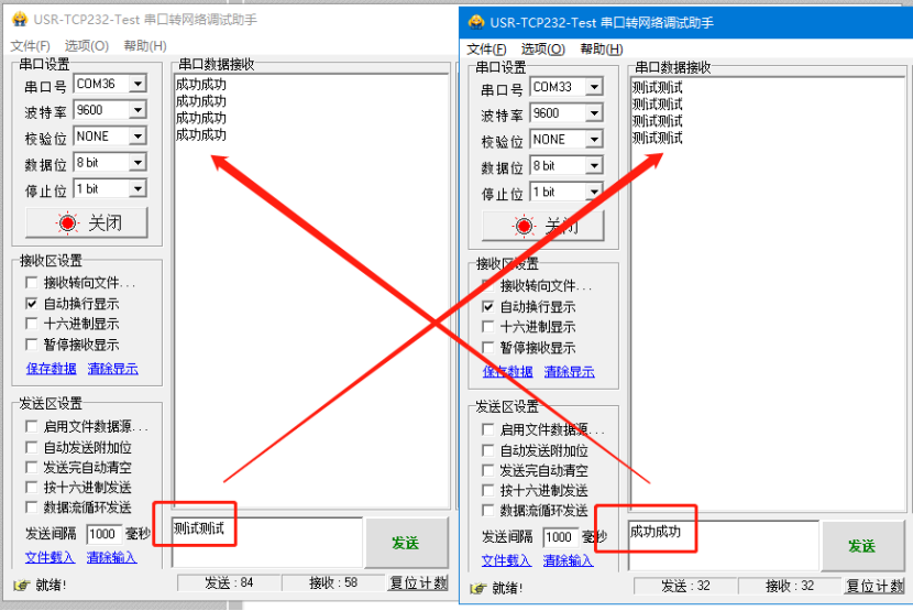 測試通信,用2個串口調(diào)試助手分別打開2個610的com口,互發(fā)數(shù)據(jù)。