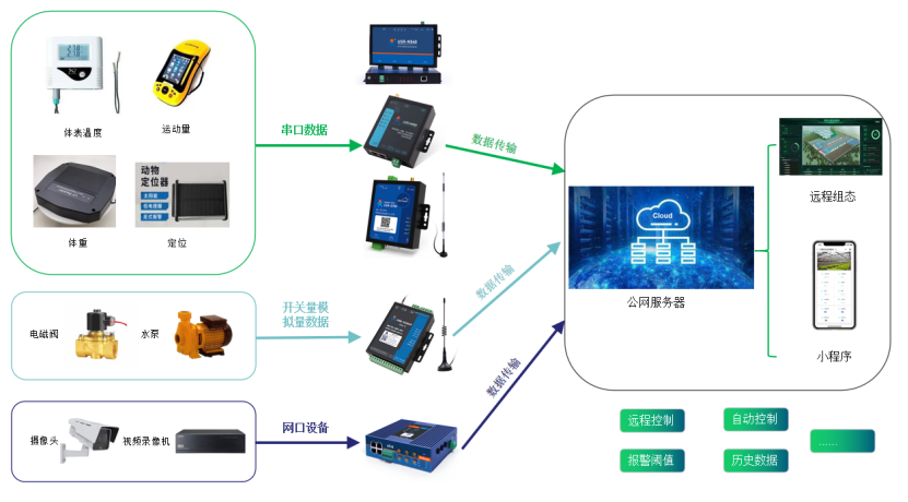 v 若現(xiàn)場終端設(shè)備為串口設(shè)備,可以通過串口服務(wù)器、wifi串口服務(wù)器或DTU將數(shù)據(jù)傳輸至遠(yuǎn)程服務(wù)器顯示。若現(xiàn)場有4G信號時(shí)可選用DTU進(jìn)行數(shù)據(jù)傳輸;若方便布線可選用串口服務(wù)器;若現(xiàn)場有wifi覆蓋可選用wifi串口服務(wù)器;