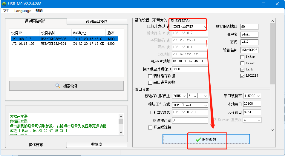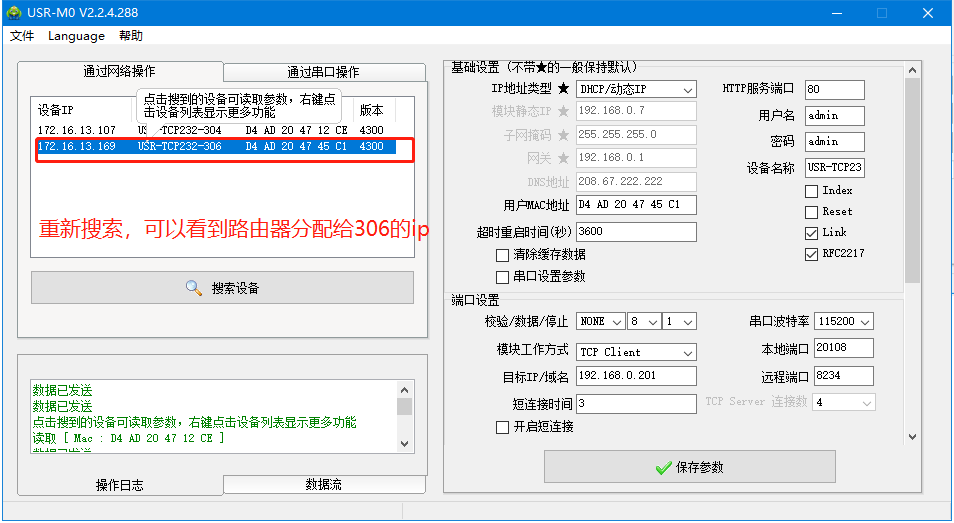 306和電腦都接到同一個路由器上,用M0軟件搜索到306,出廠默認(rèn)ip是192.168.0.7,雙擊顯示右邊參數(shù),ip選擇動態(tài)獲取,保存參數(shù),重新搜索,可以看到路由器分配給給306的ip。