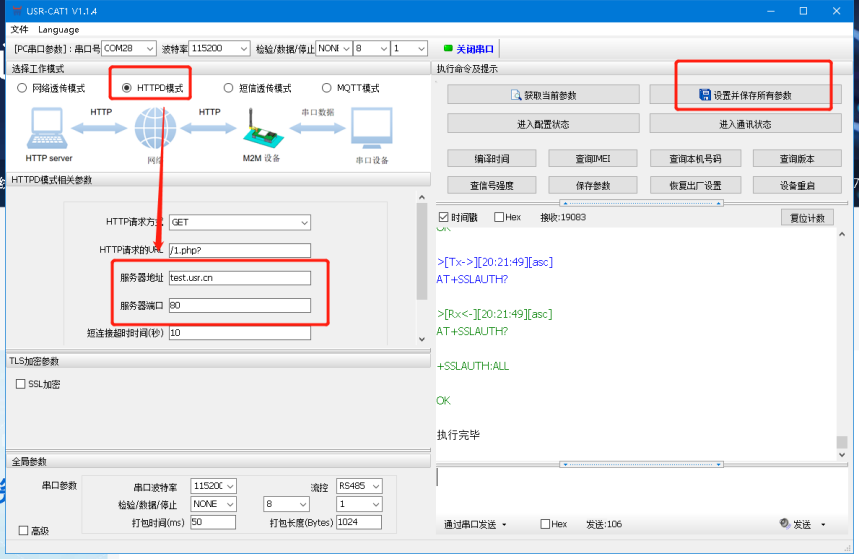 2、點(diǎn)擊HTTPD模式,配置服務(wù)器的信息。設(shè)置HTTP請(qǐng)求方式為GET,HTTP服務(wù)器地址:test.usr.cn, HTTP服務(wù)器端口號(hào)為80,HTTP報(bào)頭路徑為/1.php?,設(shè)置完成后點(diǎn)擊設(shè)置并保存所有參數(shù)。最后點(diǎn)擊進(jìn)入通訊狀態(tài)。