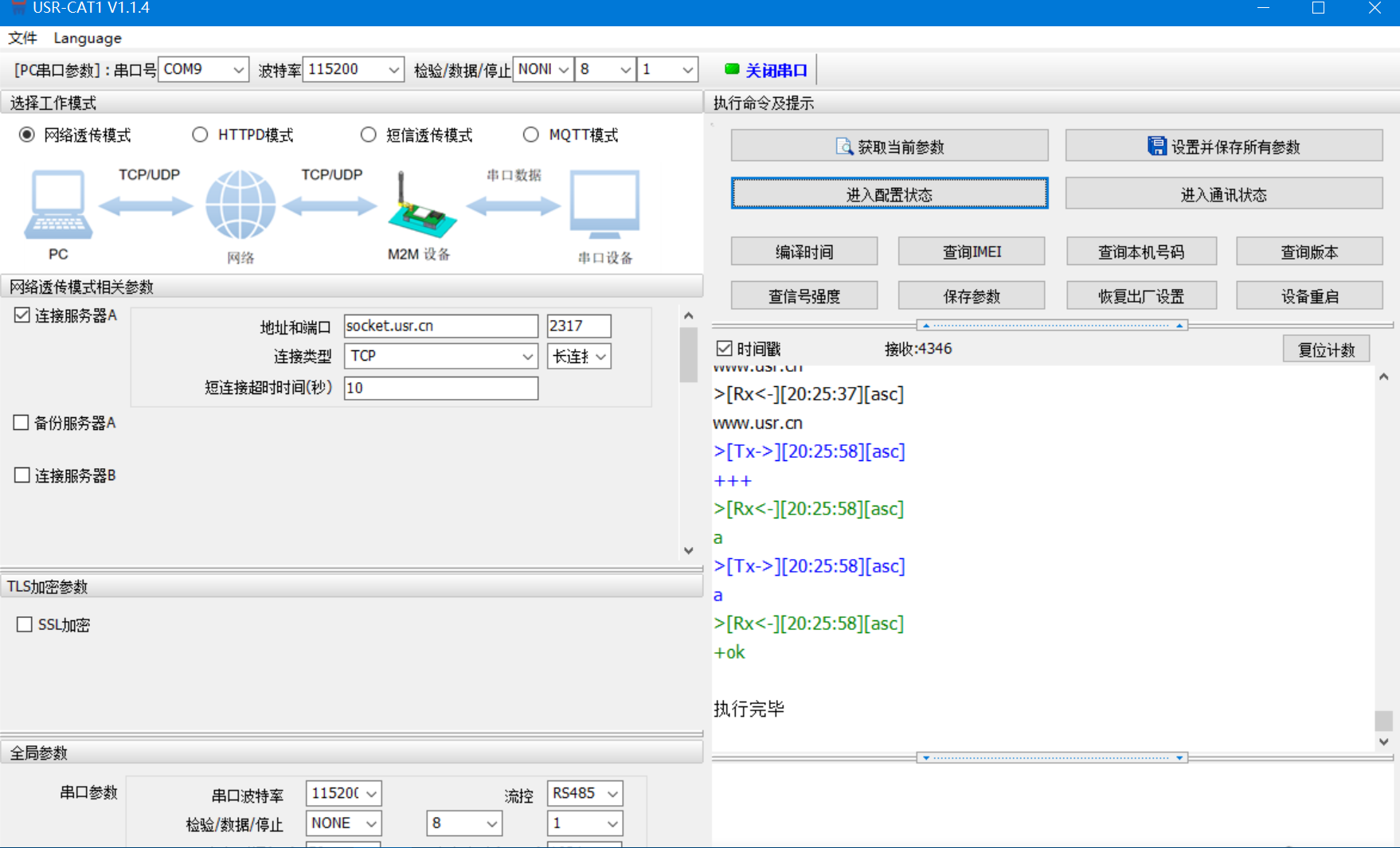 注:點擊進入配置狀態(tài),如果模塊能返回+ok的字符,說明電腦和模塊連接是沒有問題的