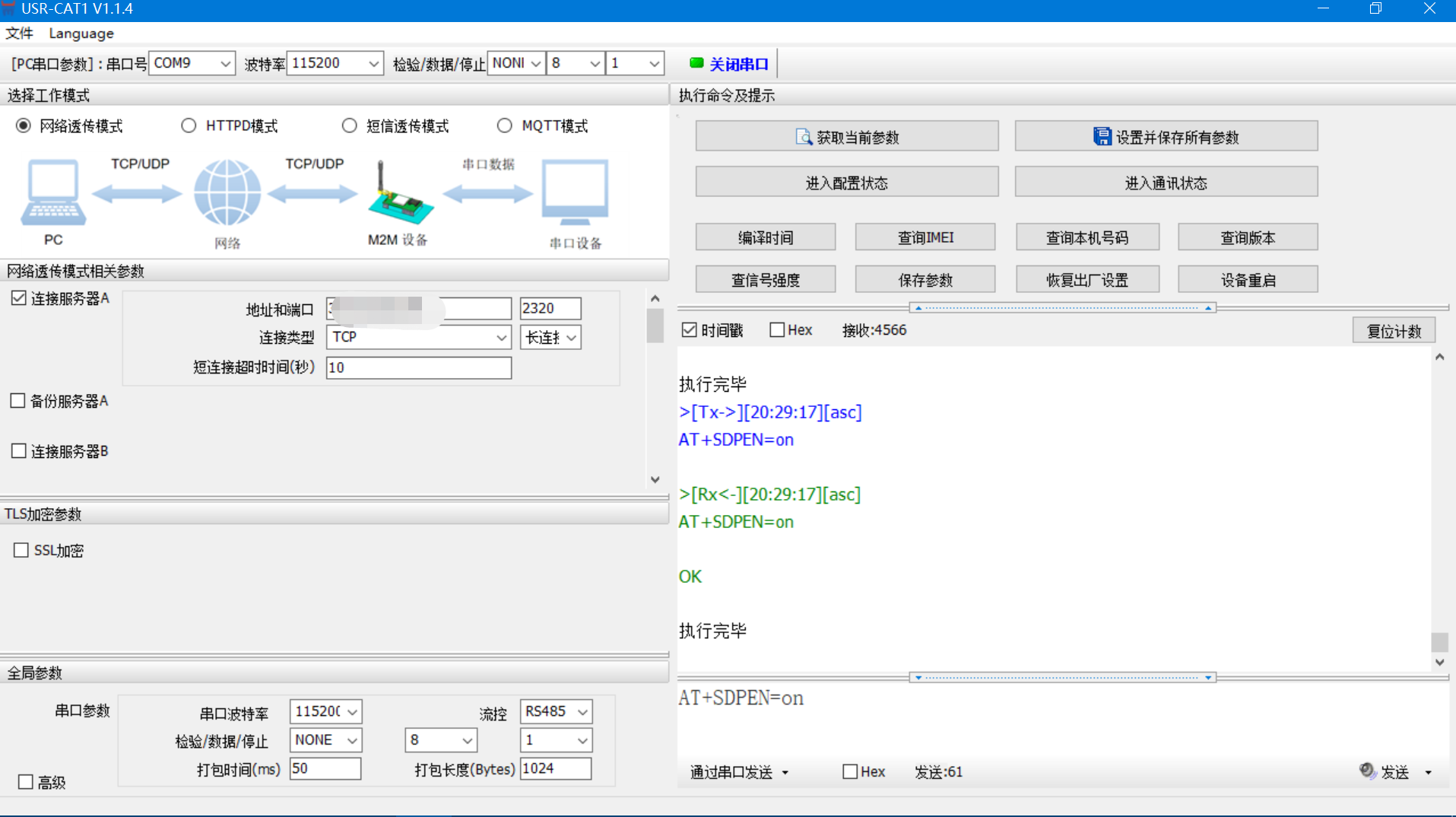3、使能socket套接字分發(fā)功能:發(fā)送AT+SDPEN=ON(AT指令后需要加回車換行),設(shè)置連接的服務(wù)器地址和端口號,然后重啟設(shè)備使設(shè)置生效。注:我用的是我司測試服務(wù)器,大家以實際使用服務(wù)器為準(zhǔn)填寫。