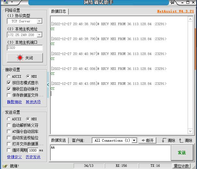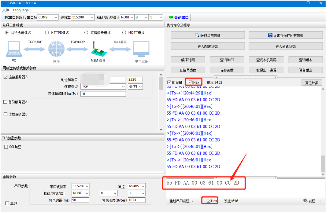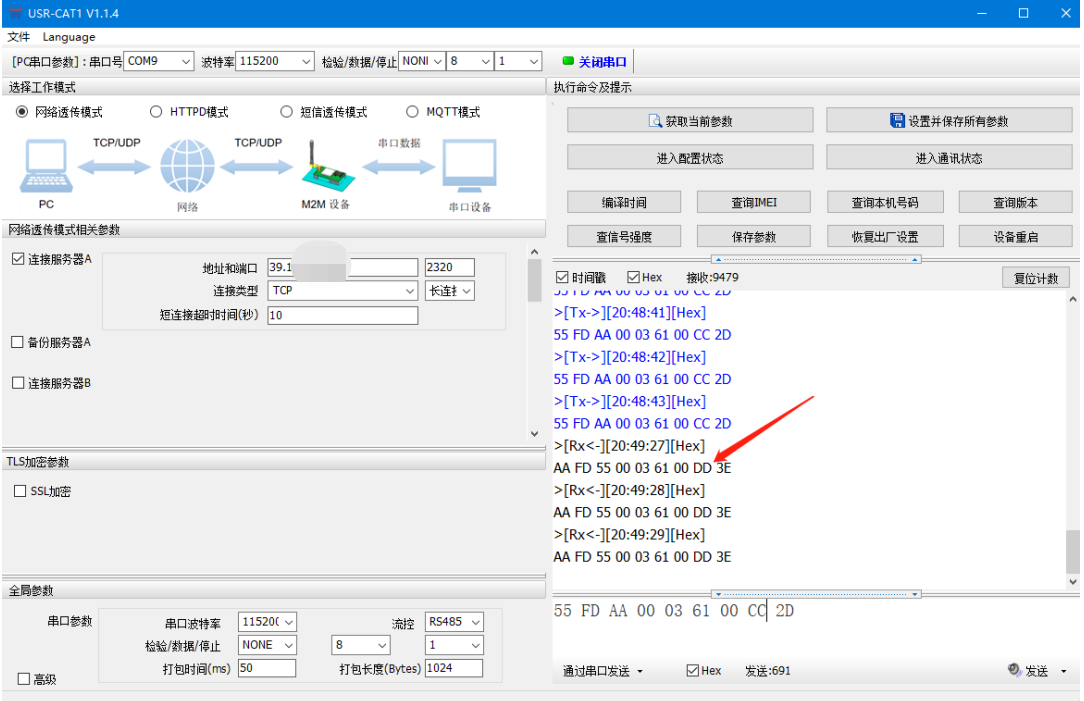 4、重啟后,模塊會主動連接服務(wù)器,通過串口發(fā)送指定格式的數(shù)據(jù)出去。