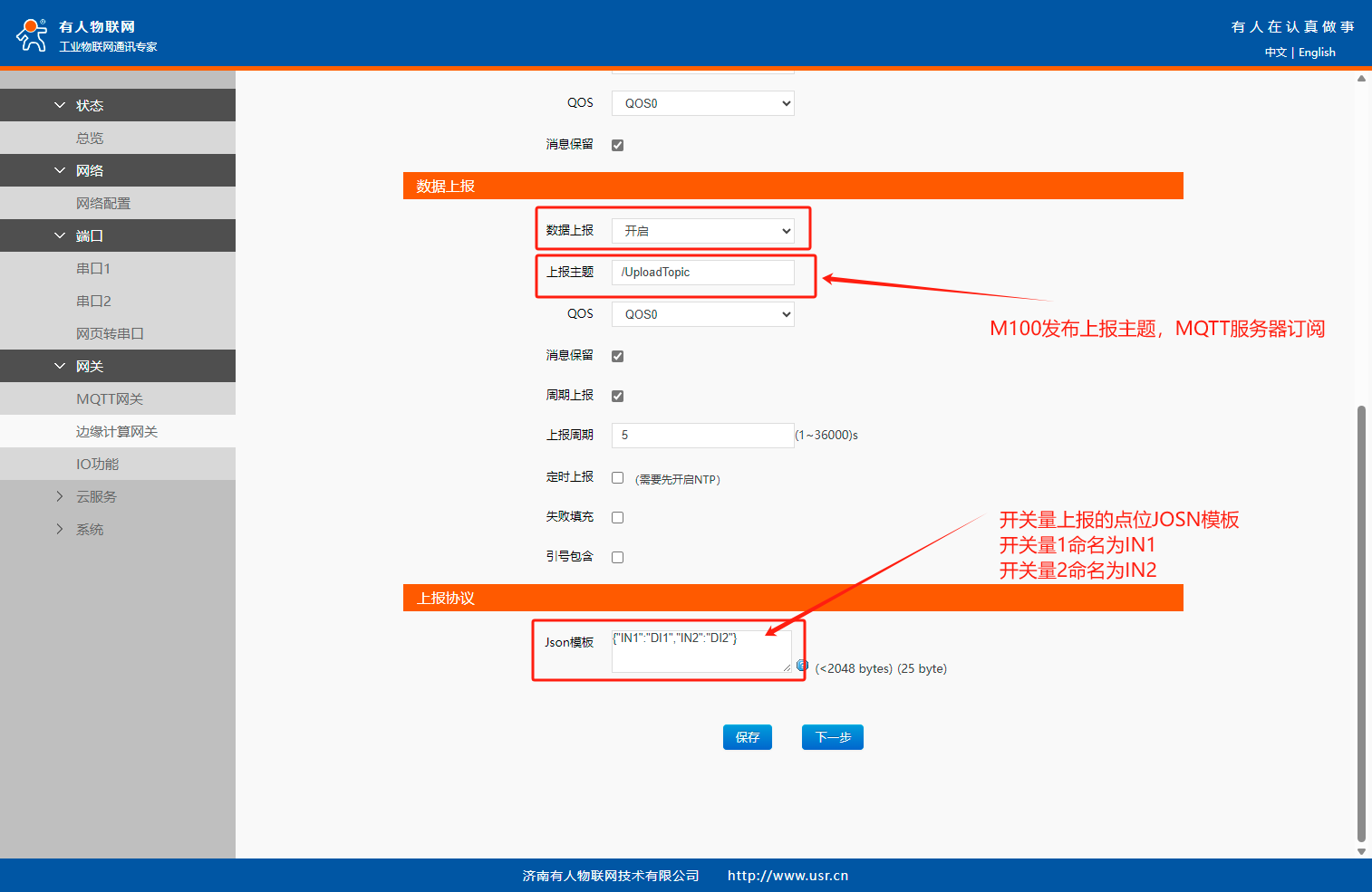 數(shù)據(jù)上報(bào)中開啟數(shù)據(jù)上報(bào)功能,設(shè)置上報(bào)主題,JOSN模板中定義要上報(bào)的開關(guān)量信息