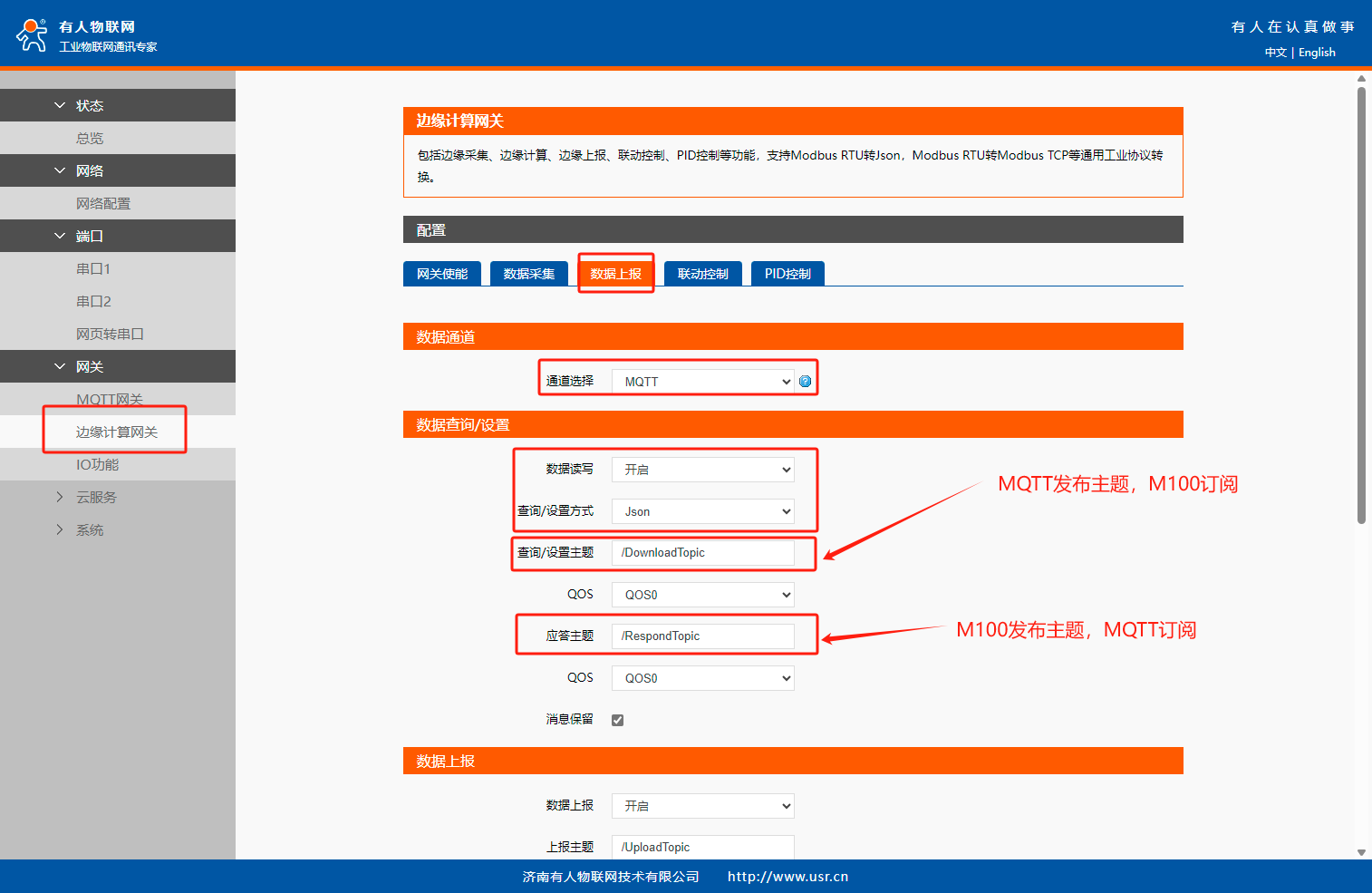 數(shù)據(jù)上報(bào)通道選擇MQTT,數(shù)據(jù)查詢設(shè)置中開啟讀寫功能,設(shè)置發(fā)布主題和訂閱主題
