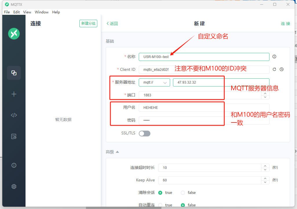 打開MQTTX軟件,新建一個(gè)連接,自定義連接名名稱,可以使用軟件生成的Client ID,注意不要和MQTT沖突即可,填入MQTT服務(wù)器信息,填入用戶名密碼。,點(diǎn)擊右上角連接。