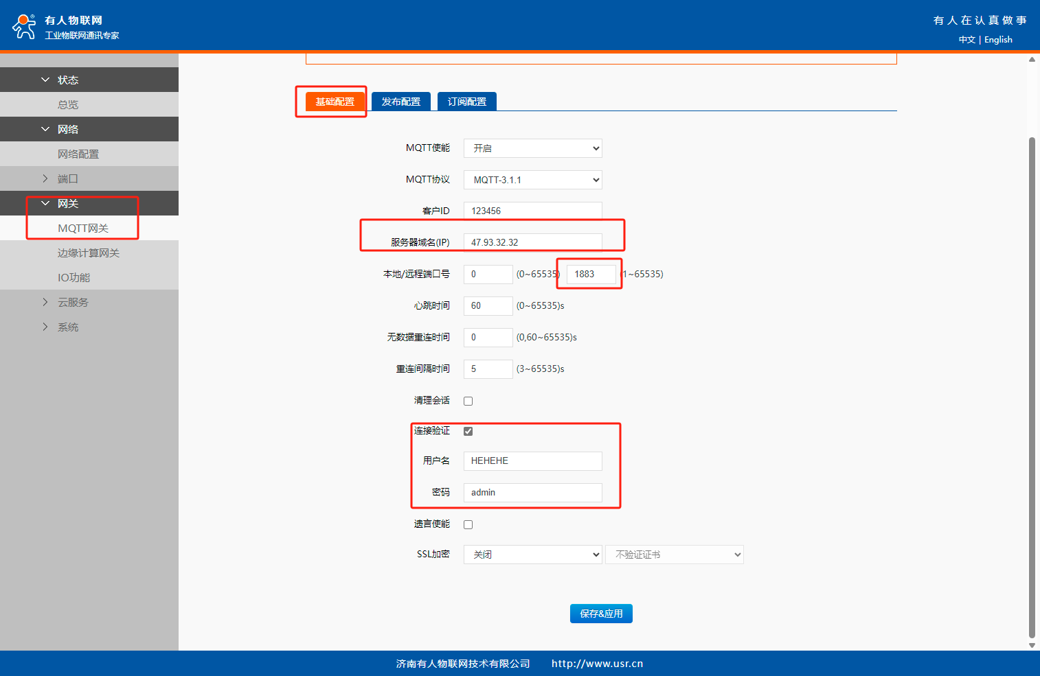 5、MQTT網(wǎng)關(guān)參數(shù)設(shè)置,開啟MQTT使能,客戶ID自定義,填入MQTT服務(wù)器信息(此為測試服務(wù)器,正式使用時(shí),不可以使用此服務(wù)器),連接驗(yàn)證用戶名密碼自定義。保存應(yīng)用,繼續(xù)配置。