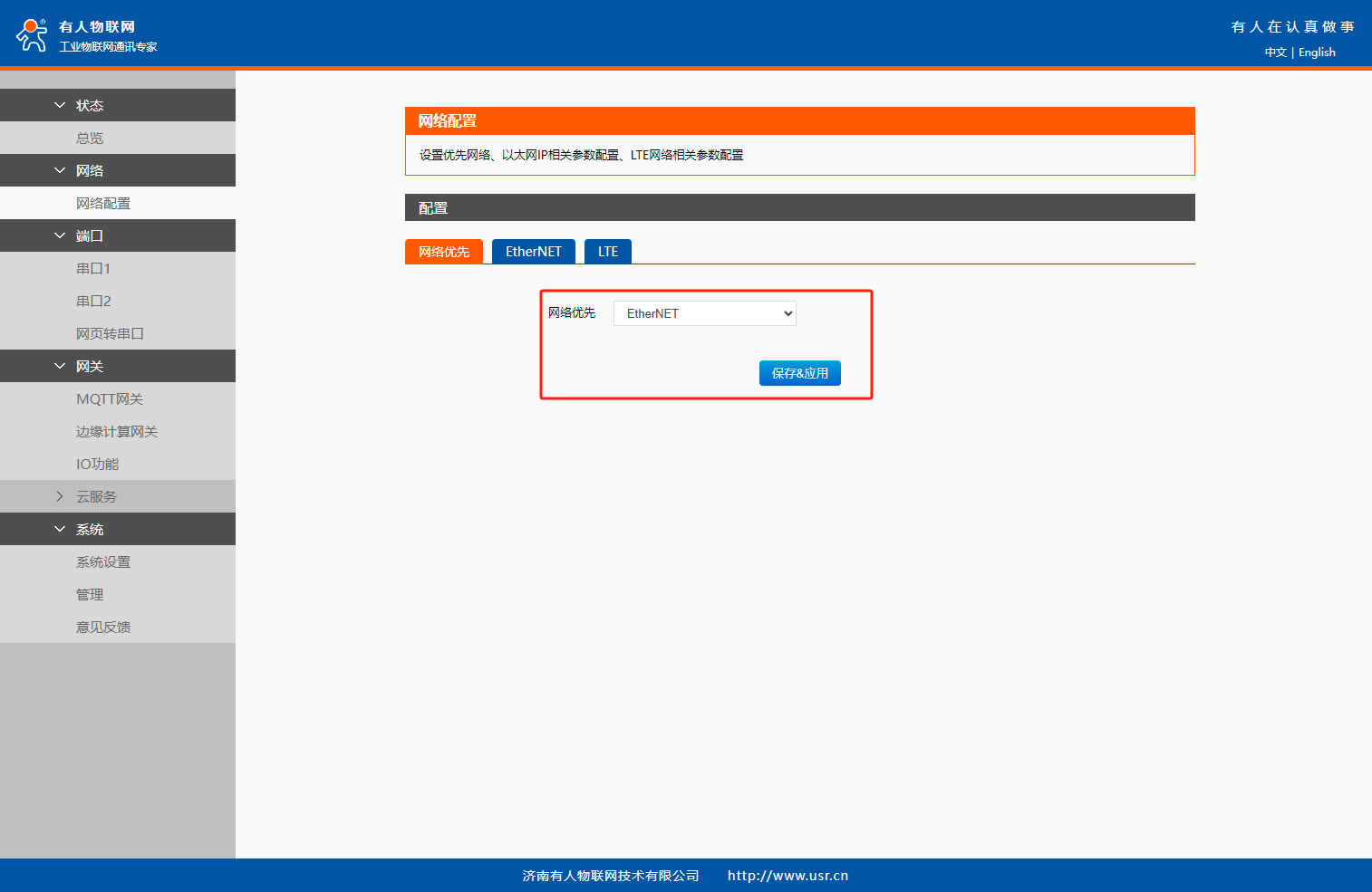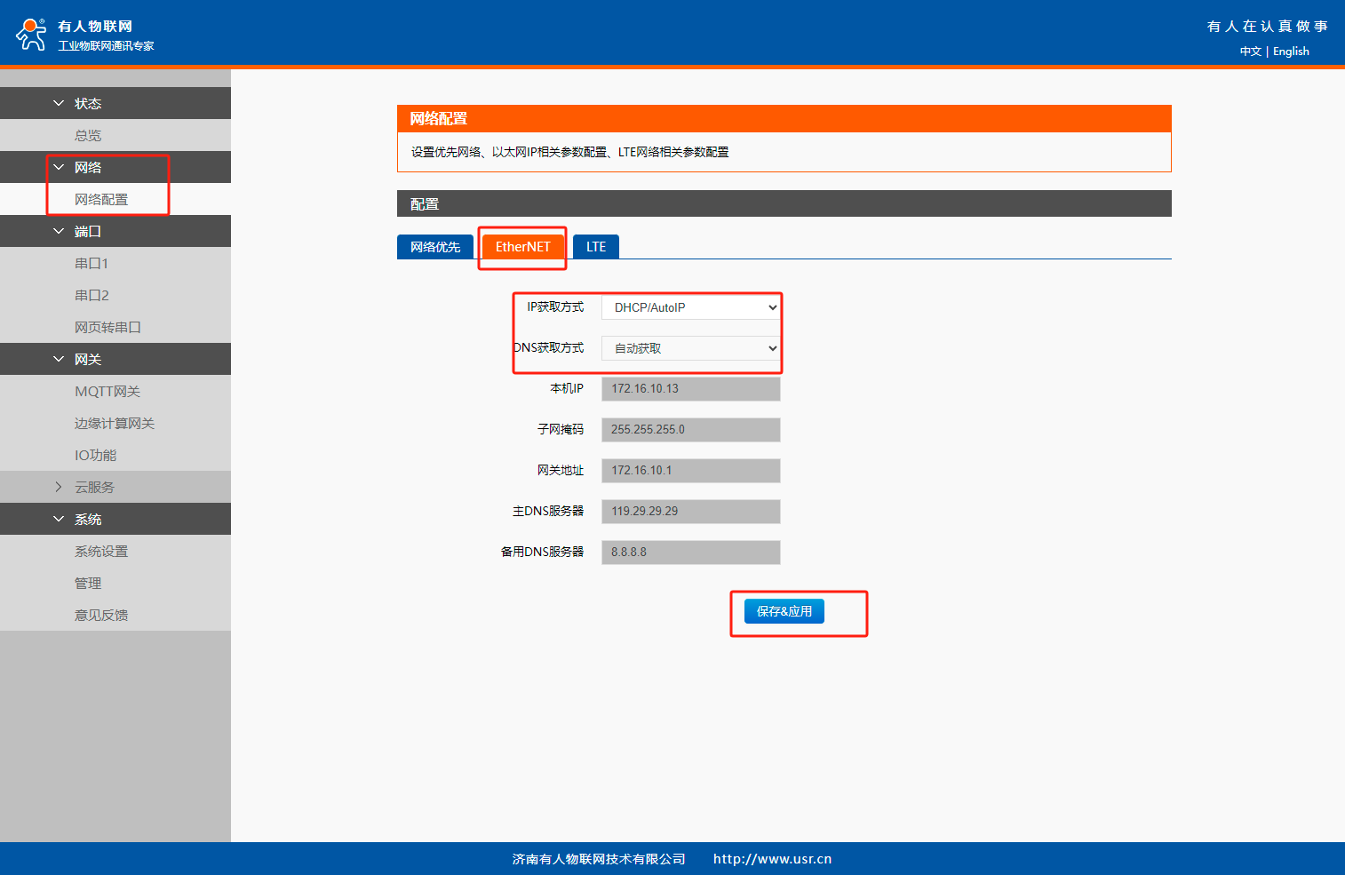 4、設(shè)置網(wǎng)絡(luò)連接方式,網(wǎng)絡(luò)優(yōu)先設(shè)置為以太網(wǎng)優(yōu)先,IP類型設(shè)置為DHCP,保存應(yīng)用,繼續(xù)配置。