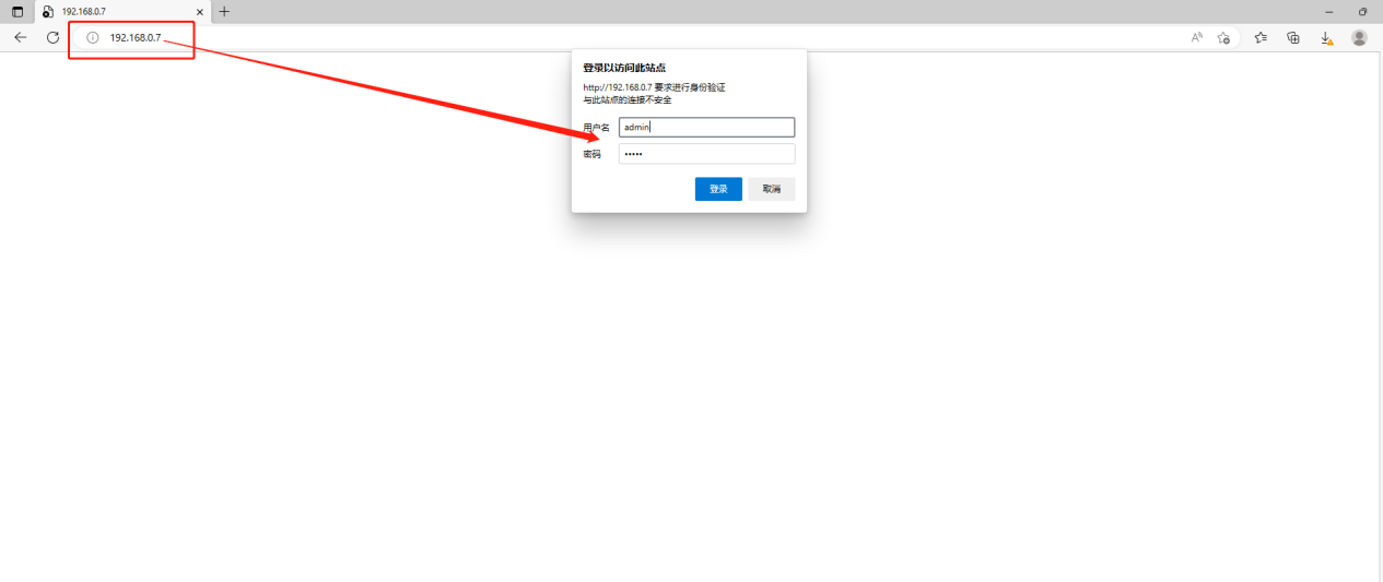 2、在電腦瀏覽器中輸入設(shè)備默認(rèn)IP:192.168.0.7,即可打開設(shè)備內(nèi)置網(wǎng)頁修改參數(shù),默認(rèn)用戶名密碼均為admin