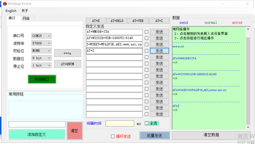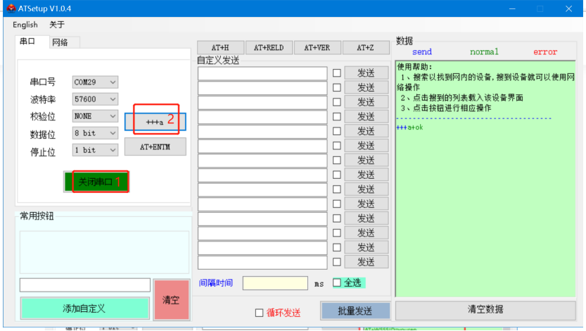 1、使用USB轉(zhuǎn)485的串口線,將設(shè)備與電腦進(jìn)行連接,在電腦的設(shè)備管理器中查看生成的端口號(hào),關(guān)閉電腦的防火墻,下載并打開AT指令軟件,使用設(shè)備默認(rèn)的串口參數(shù)(115200 N 8 1)打開串口。發(fā)送+++a進(jìn)入配置狀態(tài)。