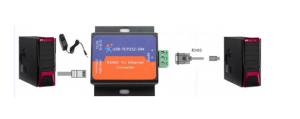 304(USR-TCP232-304,以下簡(jiǎn)稱(chēng) 304 )設(shè)備使用直流穩(wěn)壓5V供電,網(wǎng)口使用網(wǎng)線連接到PC機(jī)網(wǎng)口,RS485轉(zhuǎn)USB調(diào)試線接PC機(jī)USB口